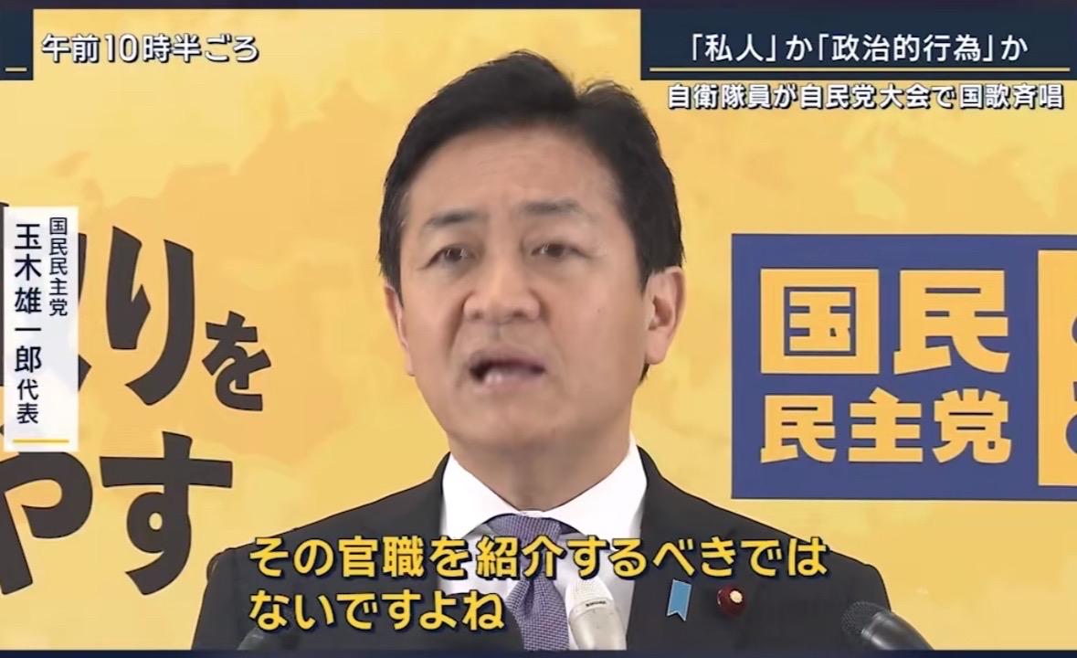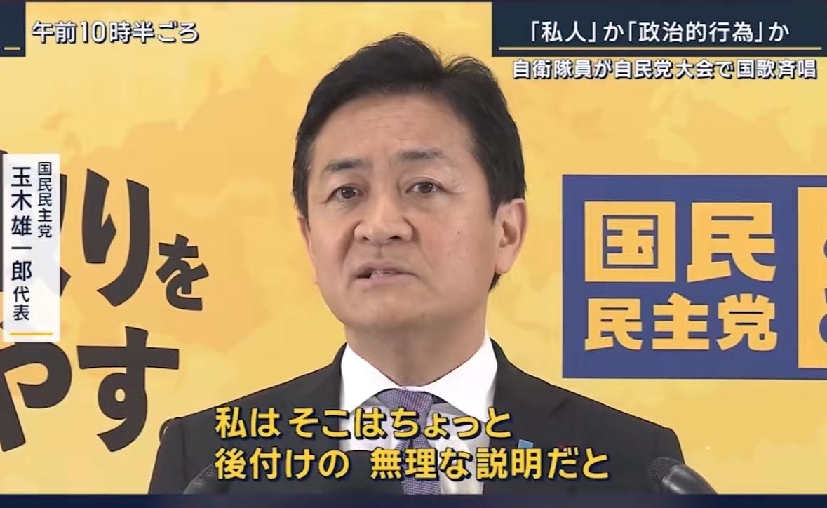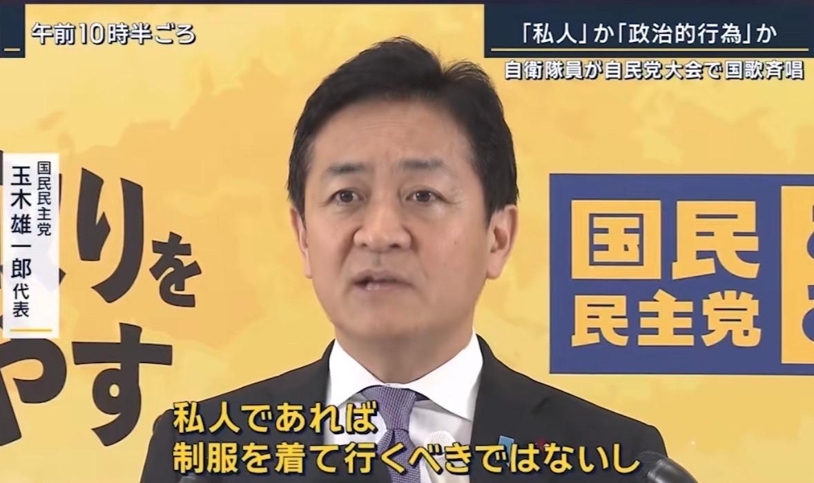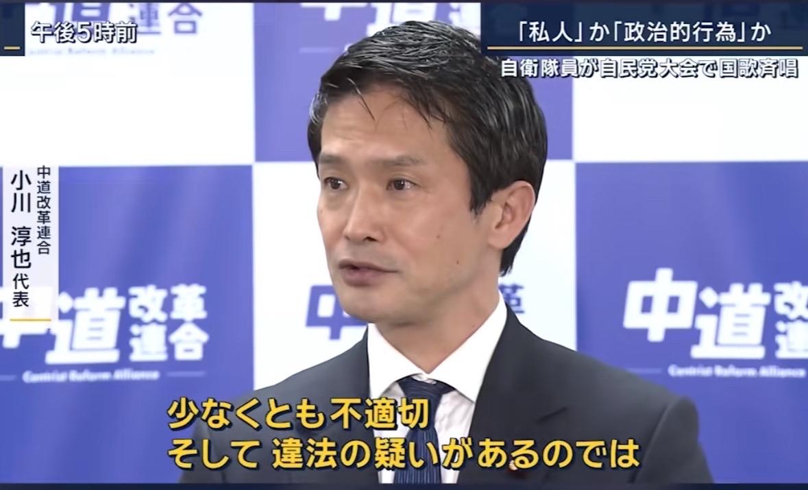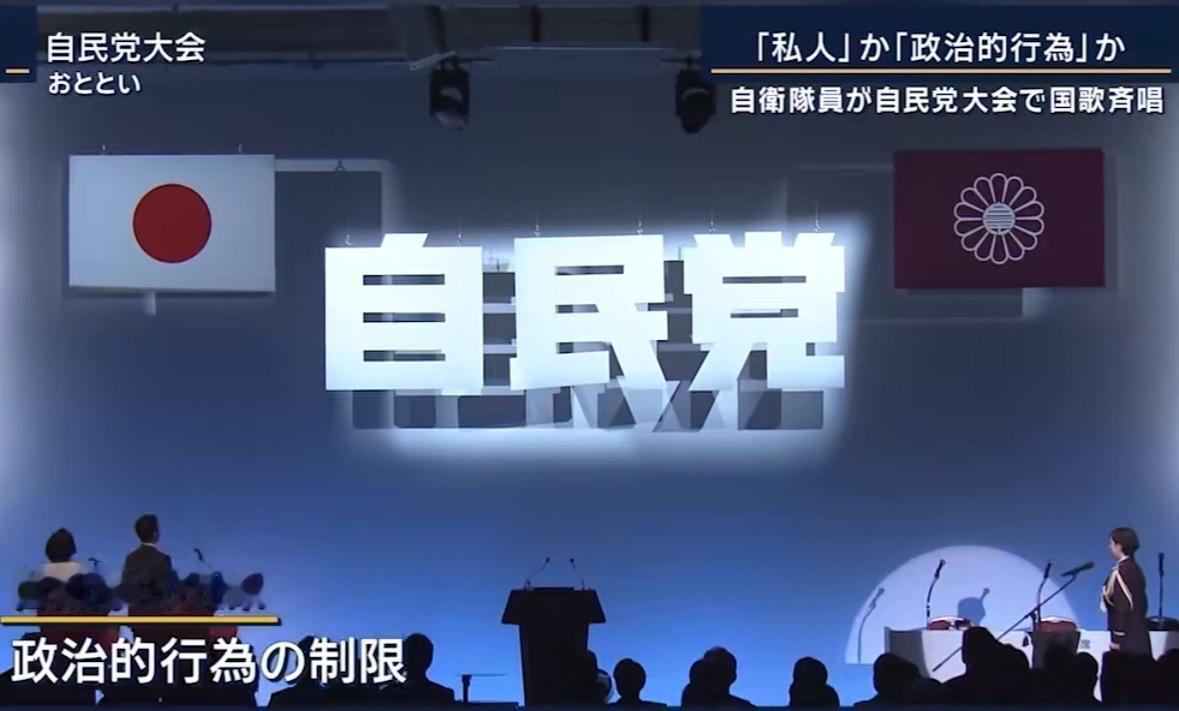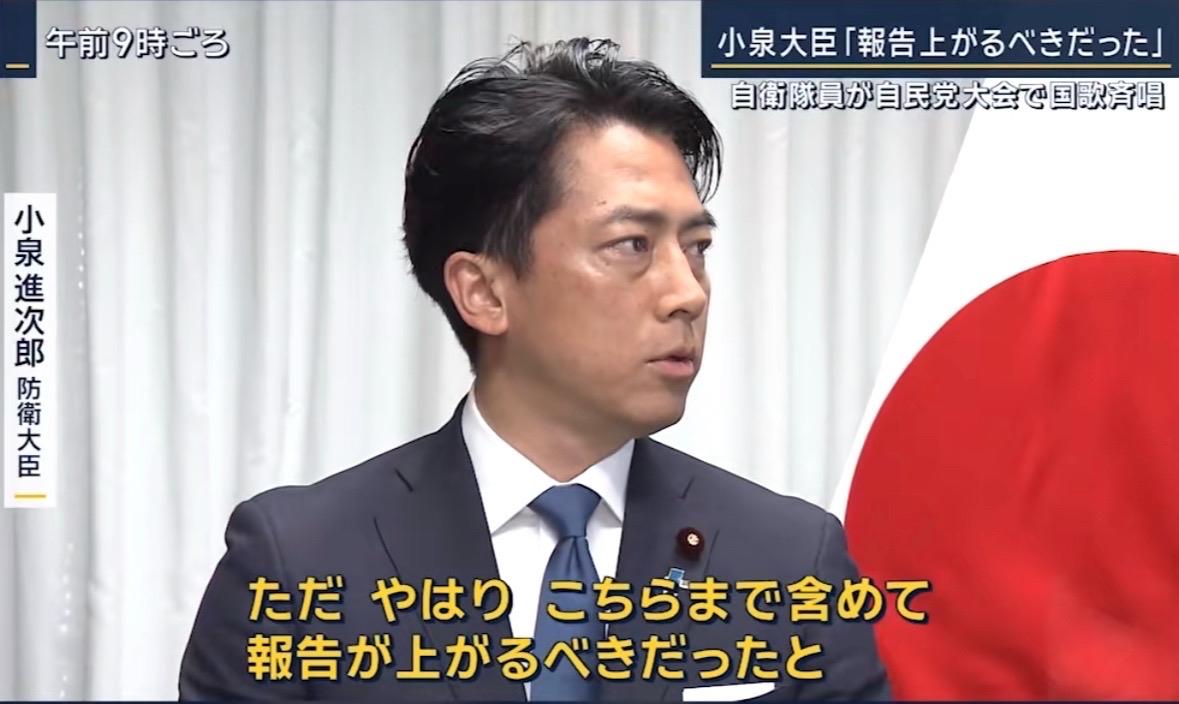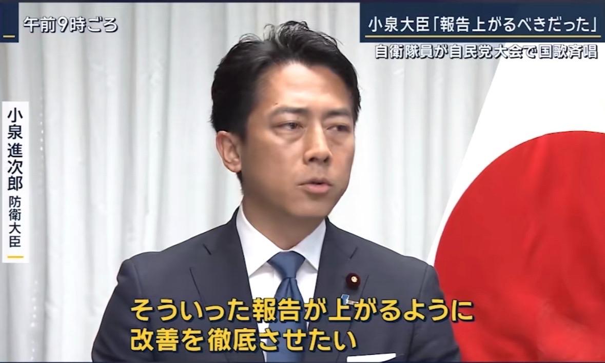 陆上自卫队中央音乐队1等陆曹穿着制服在自民党大会带头齐唱日本国歌,此举违反自卫队法61条“限制政治性行为”。面对在野党的批评,高市狡辩这是私人行为,没有法律问题,小泉明知触法也只能说应该报告。