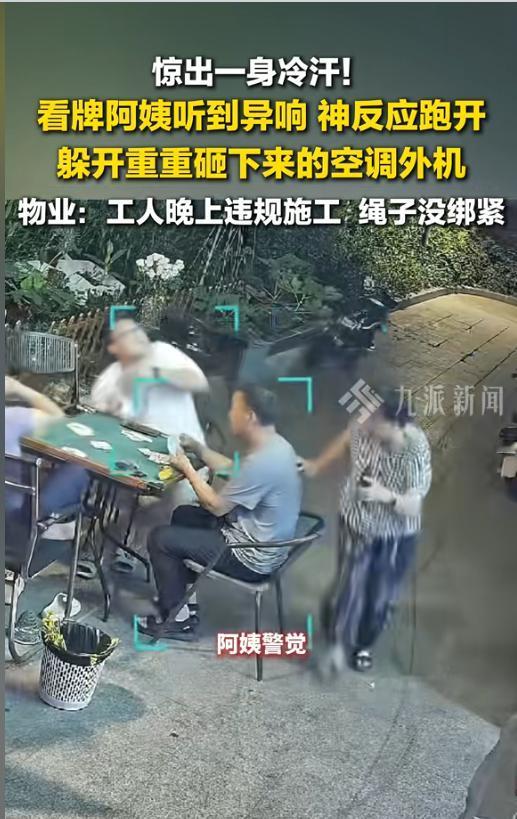 突然间,阿姨听见一声异响,头也没抬,就往一边跑去。也就一秒钟,一台空调外机重重砸了下来,就砸在阿姨刚刚站的位置,整个外机瞬间变形。