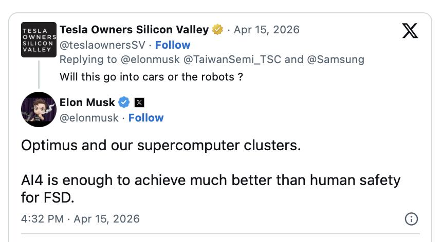 在推特上回复网友帖子中,马斯克澄清了特斯拉的AI硬件路线图,并明确表示,这款新芯片不会局限在FSD上,因为AI4已经可以实现这一点了,AI5芯片将专注于特斯拉未来的重大项目:Optimus机器人和超级计算机集群。