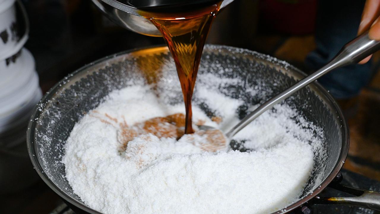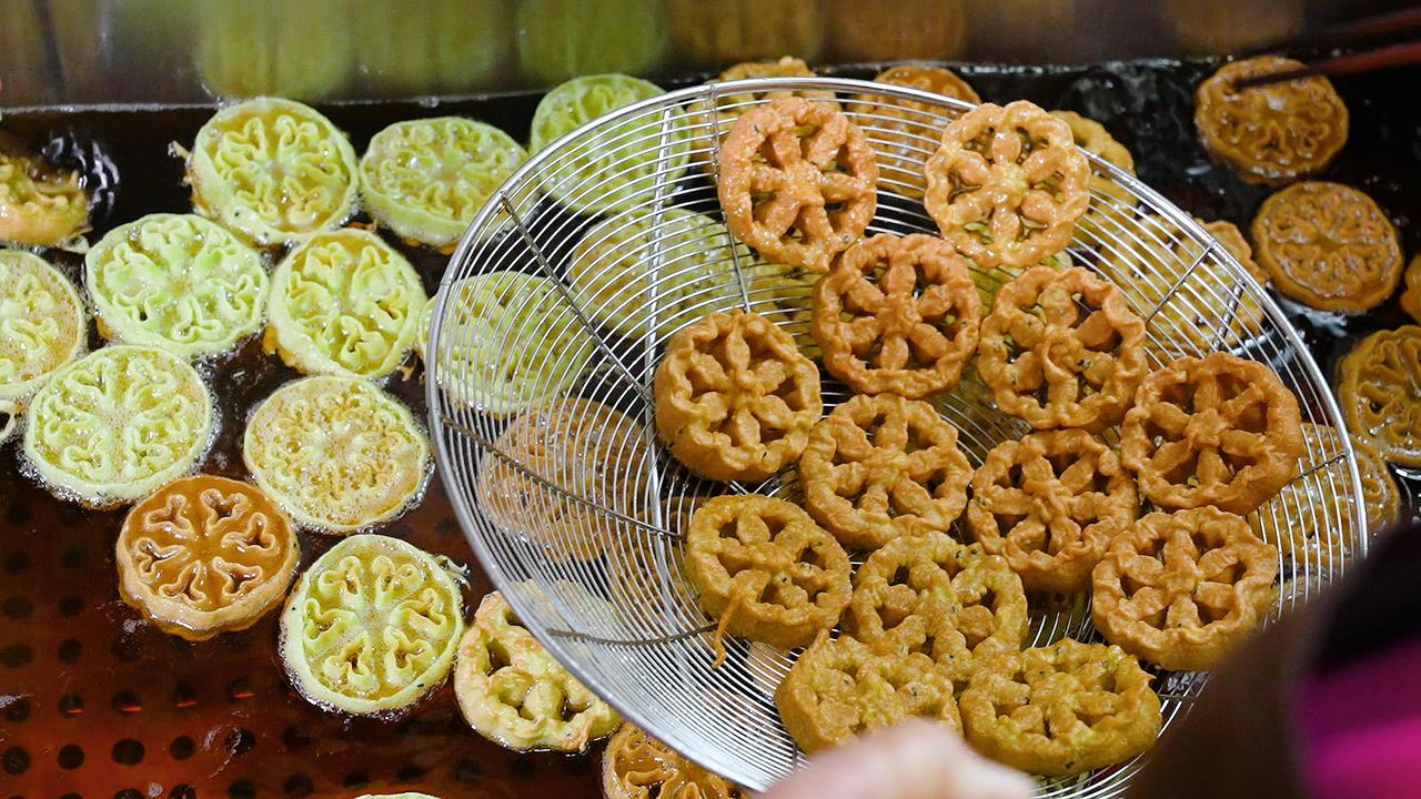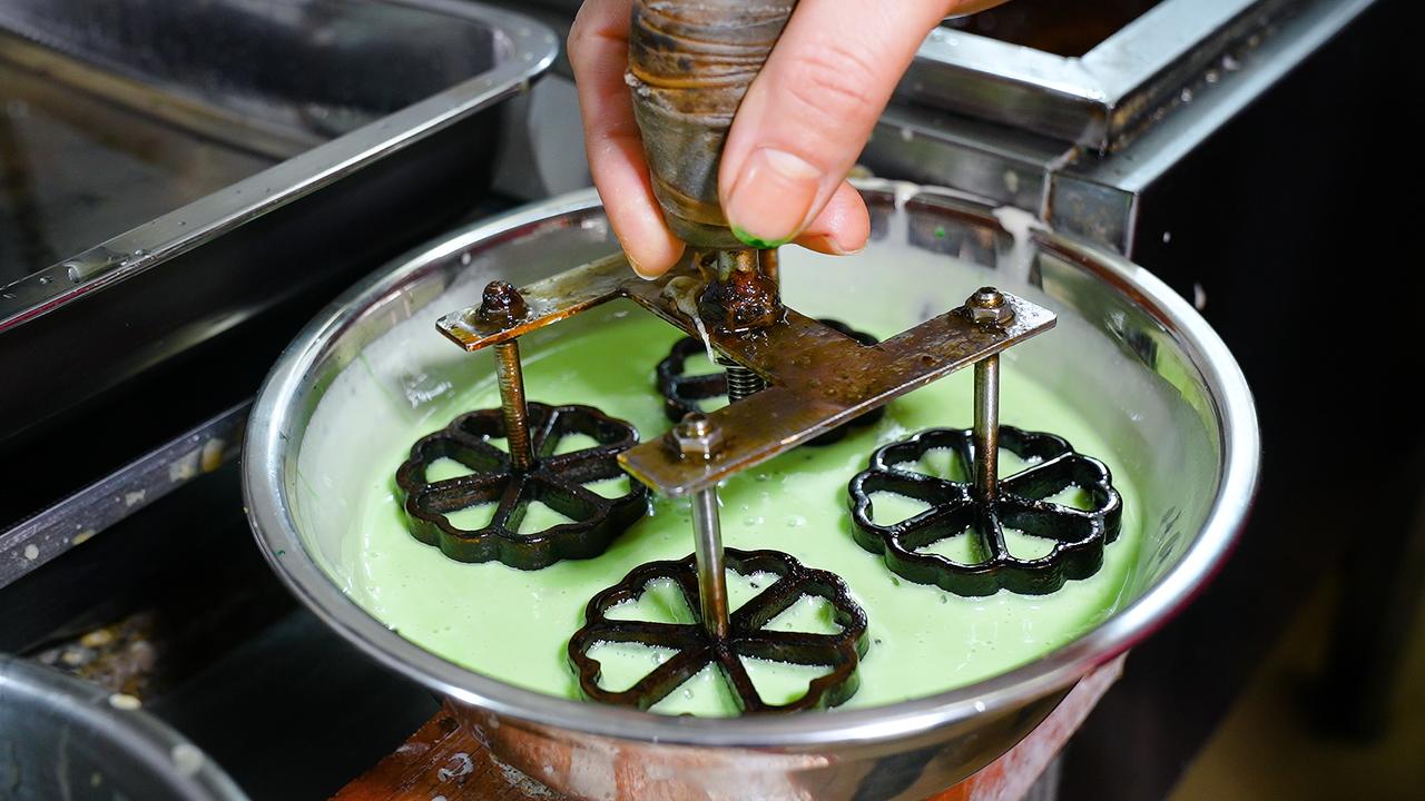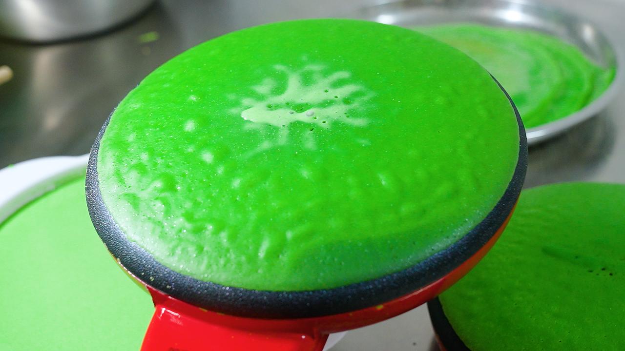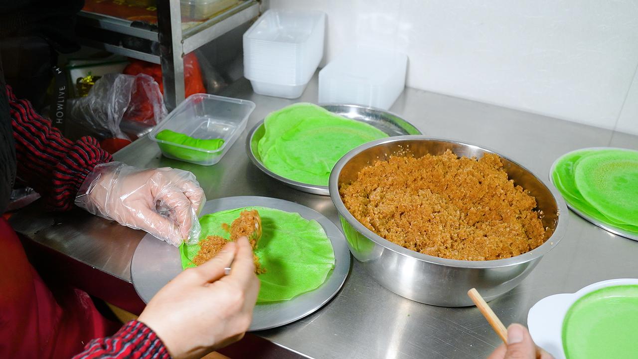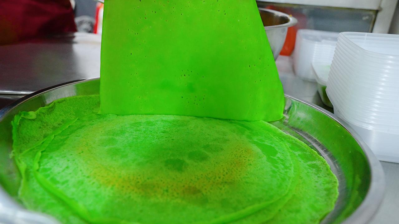而太阳花,则是更俏皮的创意。面浆蘸上模具,投入油锅。瞬间,翠绿化作金黄,花瓣绽开,薄如蝉翼。咬一口,酥脆作响,咔嚓声里是童年的欢愉。两种吃法,一软一脆,一温润一热烈,如同娘惹文化的两面:温柔地包容,也热烈地绽放。这些看似简单的小吃,其实是一代代人用手艺保存的那些年异国他乡奋斗的记忆——没有国界,只有味道在说话。