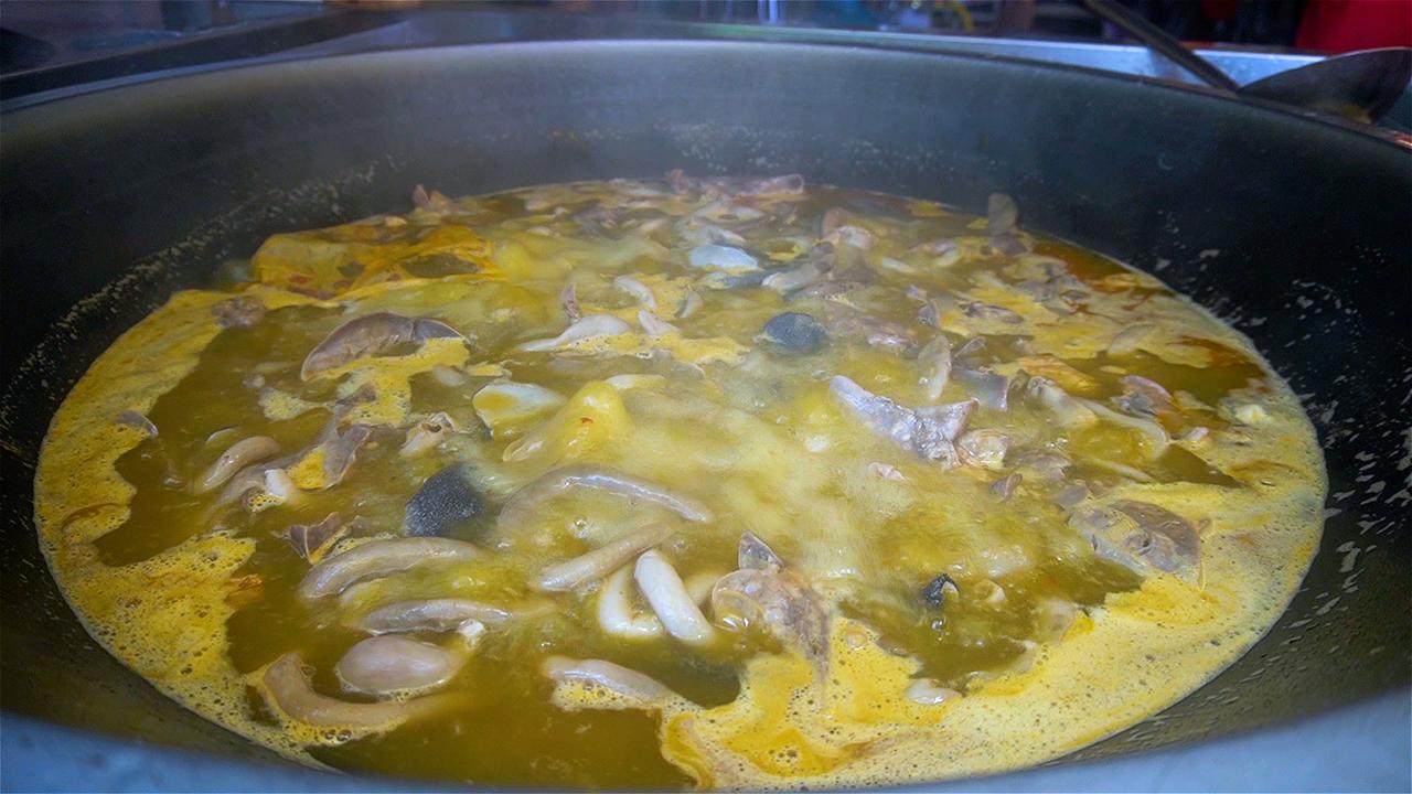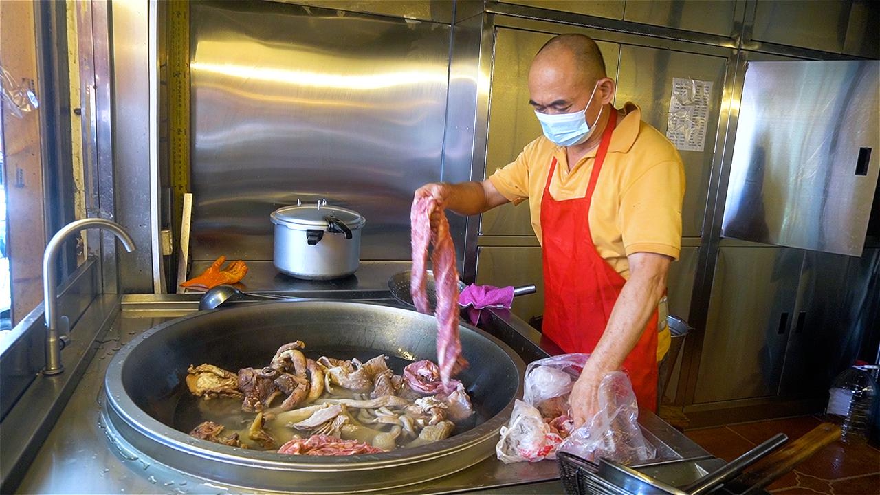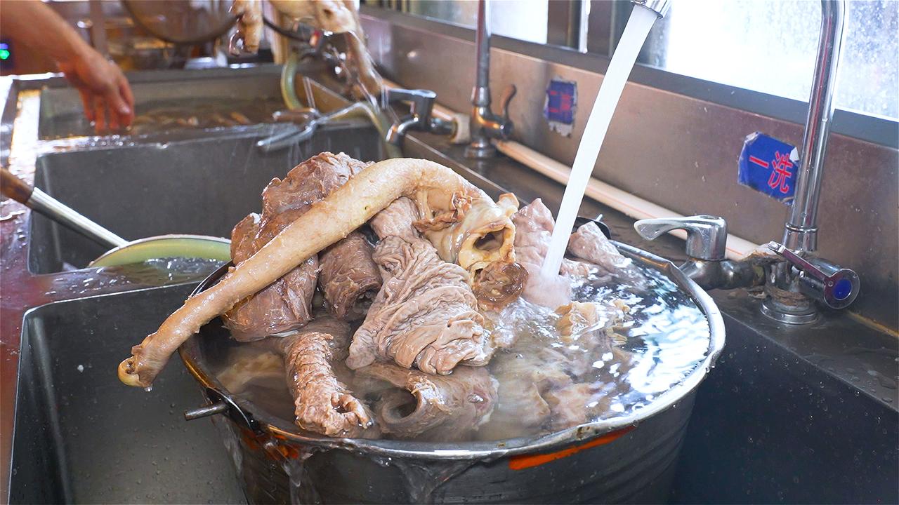 一碗牛杂汤18块,牛肉汤免费续,老顾客进门坐下先喝两碗汤暖暖胃。最绝的是牛百叶,入口脆弹,嚼着带劲儿;牛腩炖得香嫩软烂,几乎不用费力。一锅能卖出2000多,从早到晚客人没断过。舀一勺浇在米饭上,汤汁渗进米粒,三两口就见底。30年的老味道,靠的是那份不肯省事的手艺。