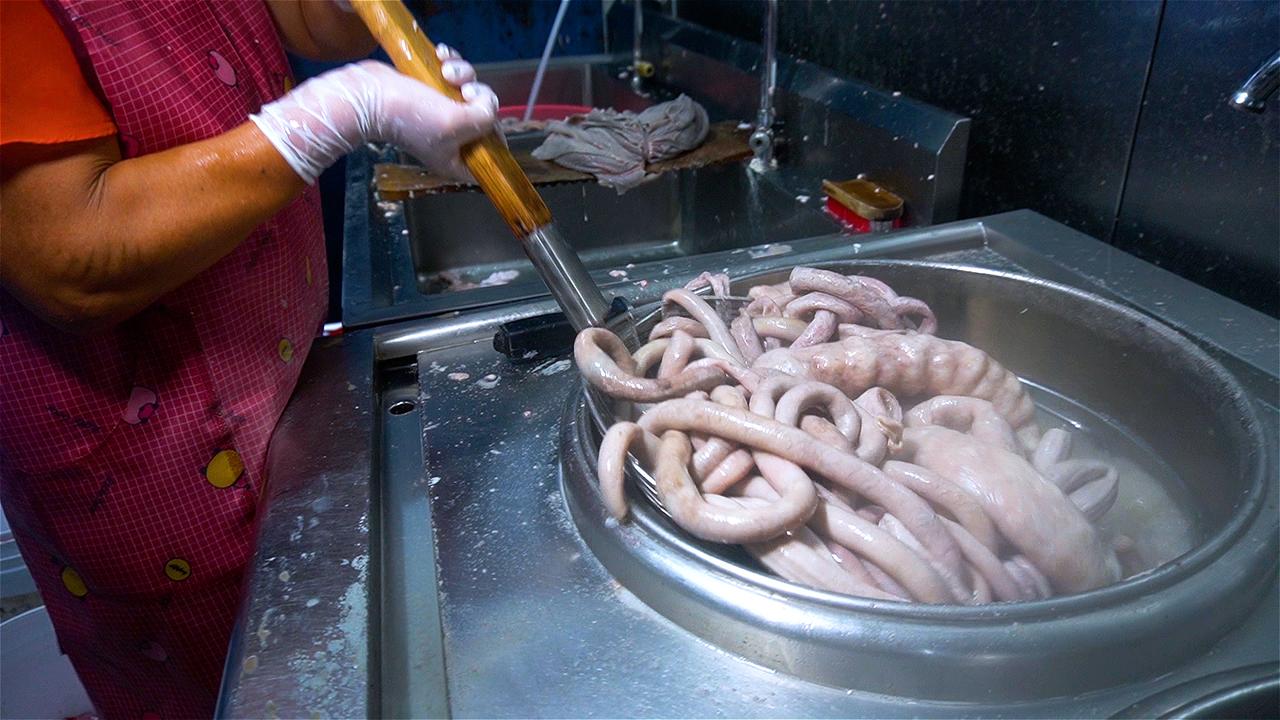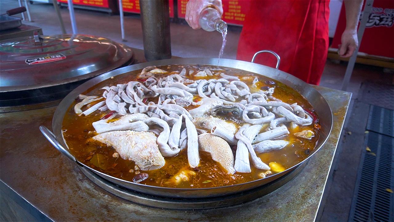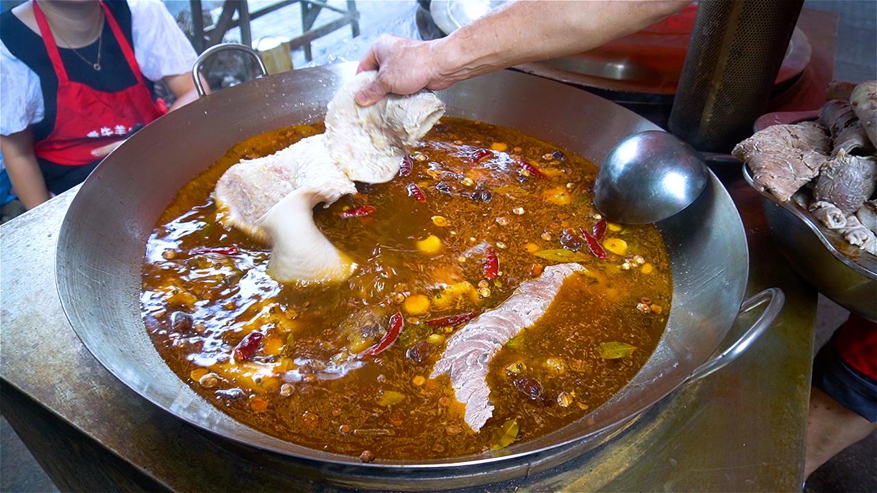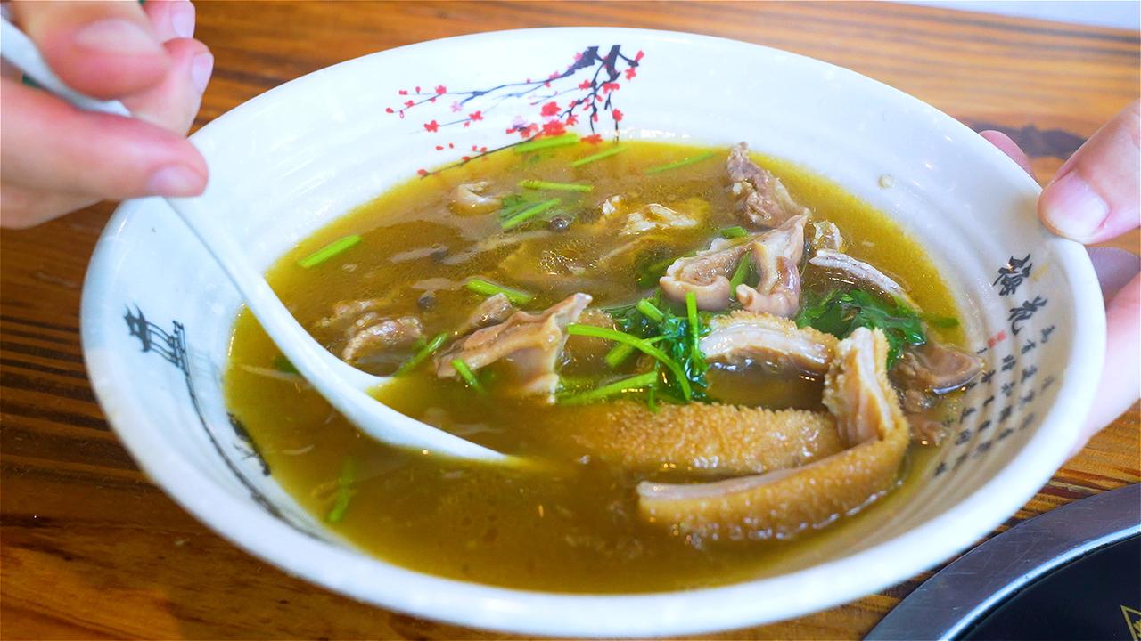 一碗牛杂汤18块,牛肉汤免费续,老顾客进门坐下先喝两碗汤暖暖胃。最绝的是牛百叶,入口脆弹,嚼着带劲儿;牛腩炖得香嫩软烂,几乎不用费力。一锅能卖出2000多,从早到晚客人没断过。舀一勺浇在米饭上,汤汁渗进米粒,三两口就见底。30年的老味道,靠的是那份不肯省事的手艺。