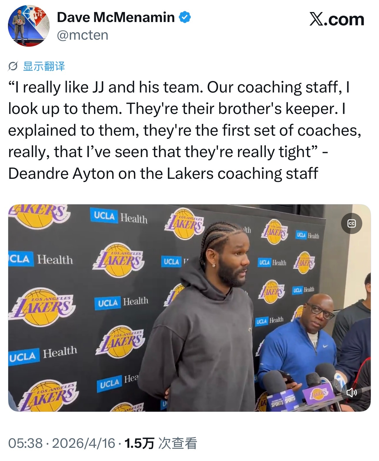 “我真的很喜欢雷迪克和他的团队,非常敬重我们的教练组,他们是彼此最坚实的后盾。我跟他们说过,这是我职业生涯里,见过的第一支真正无比团结的教练团队。一想到以湖人球员的身份打季后赛首战,我虽然不是第一次打季后赛,但这次是真的无比兴奋,兴奋到都想翻跟头了。我现在身披紫金战袍,只想拼尽全力,为球队赢球贡献自己的一切。”