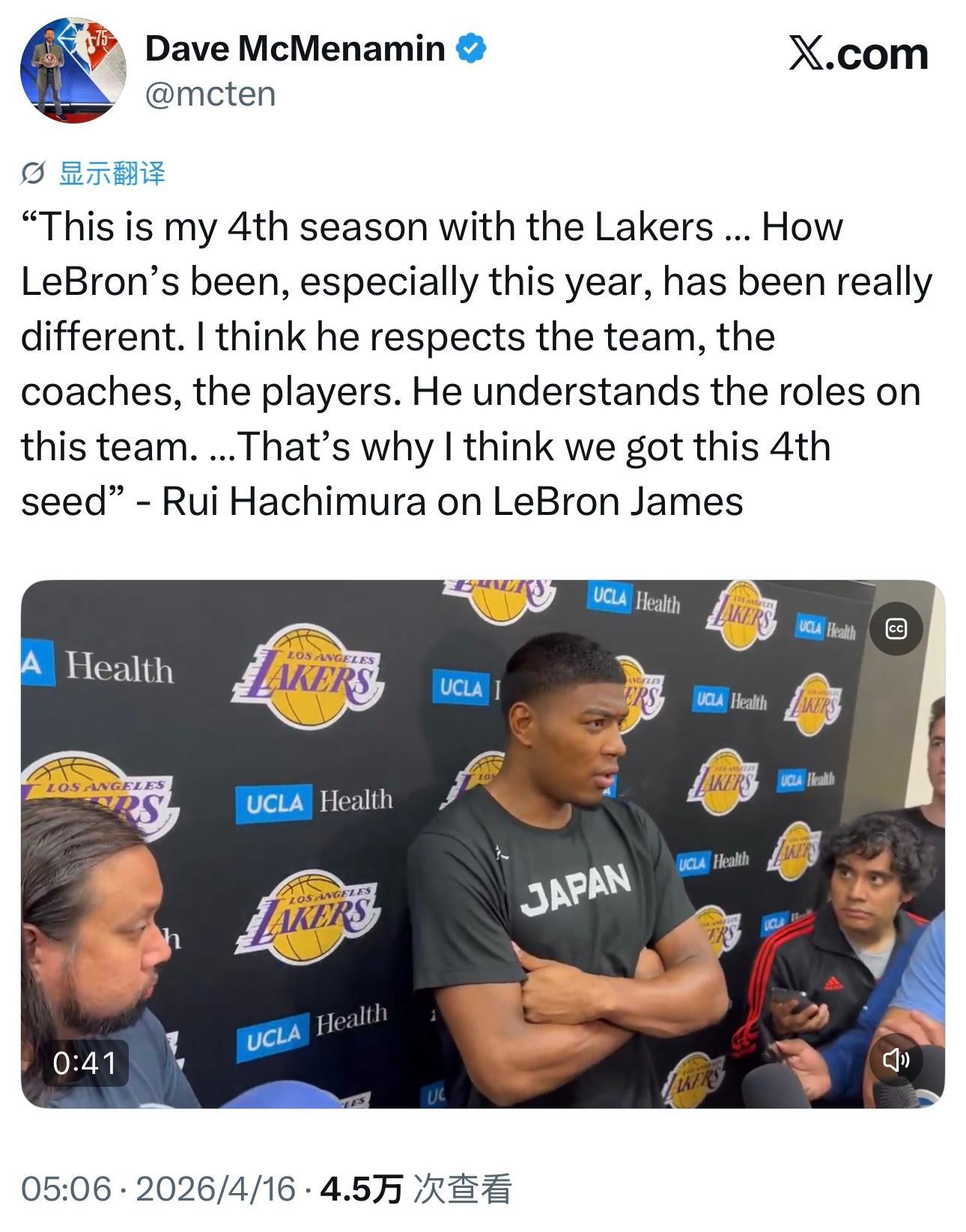 “这是我在湖人的第4个赛季了,勒布朗这几年的状态,尤其是今年,真的和以往大不相同。我觉得他发自内心地尊重这支球队、教练组和每一位队友,也完全清楚自己在队里的角色定位。这就是我们能拿到西部第4的原因。”