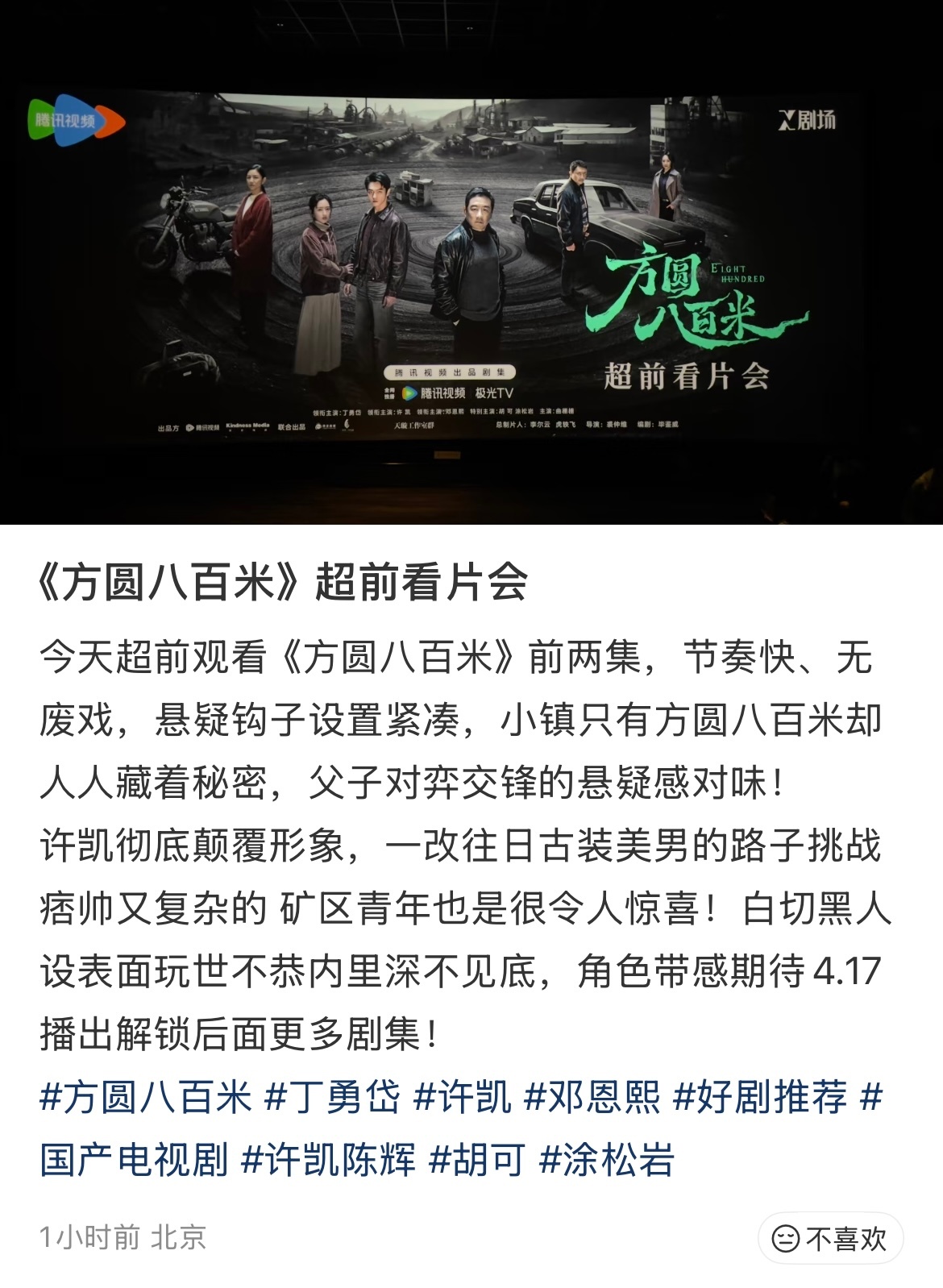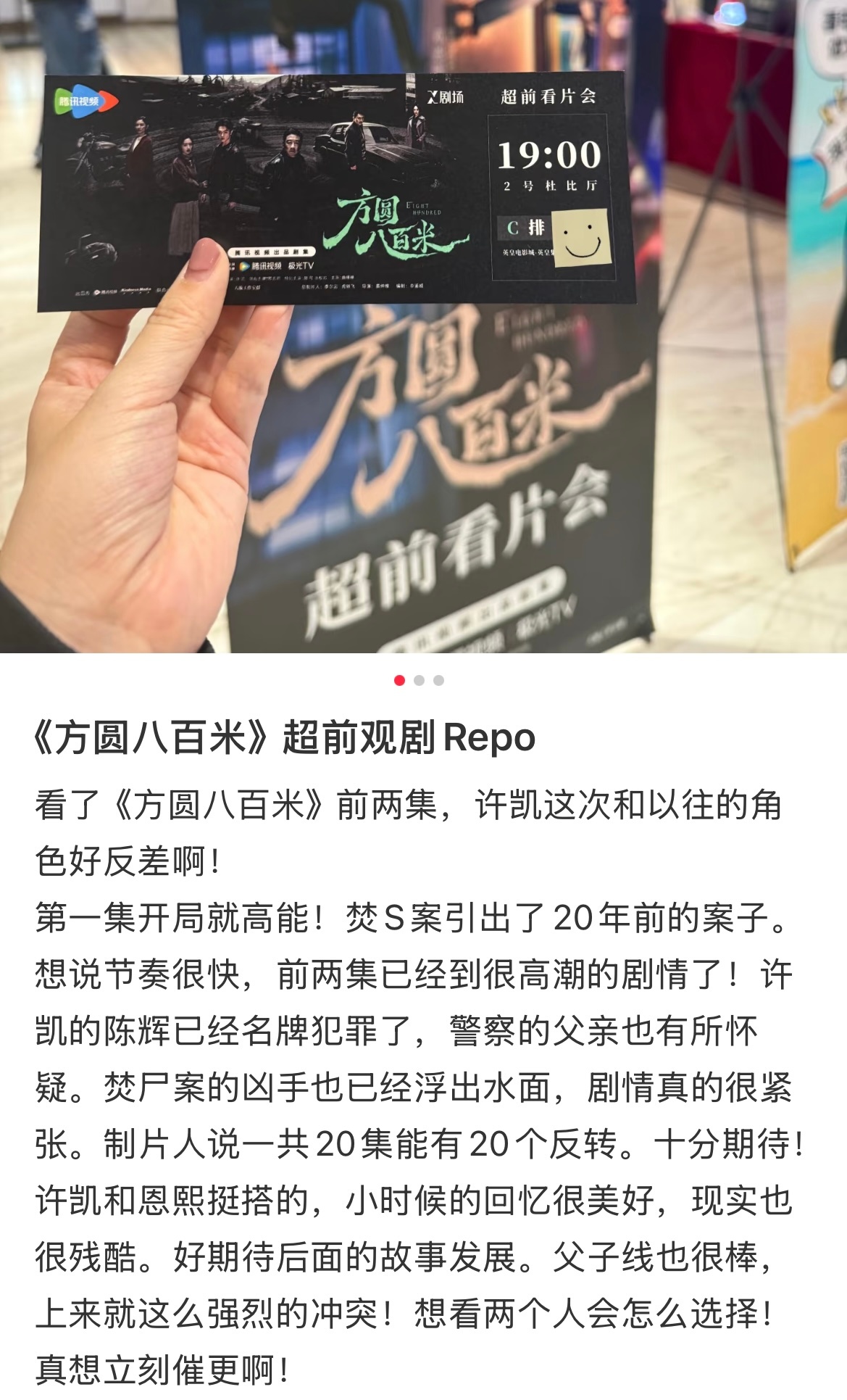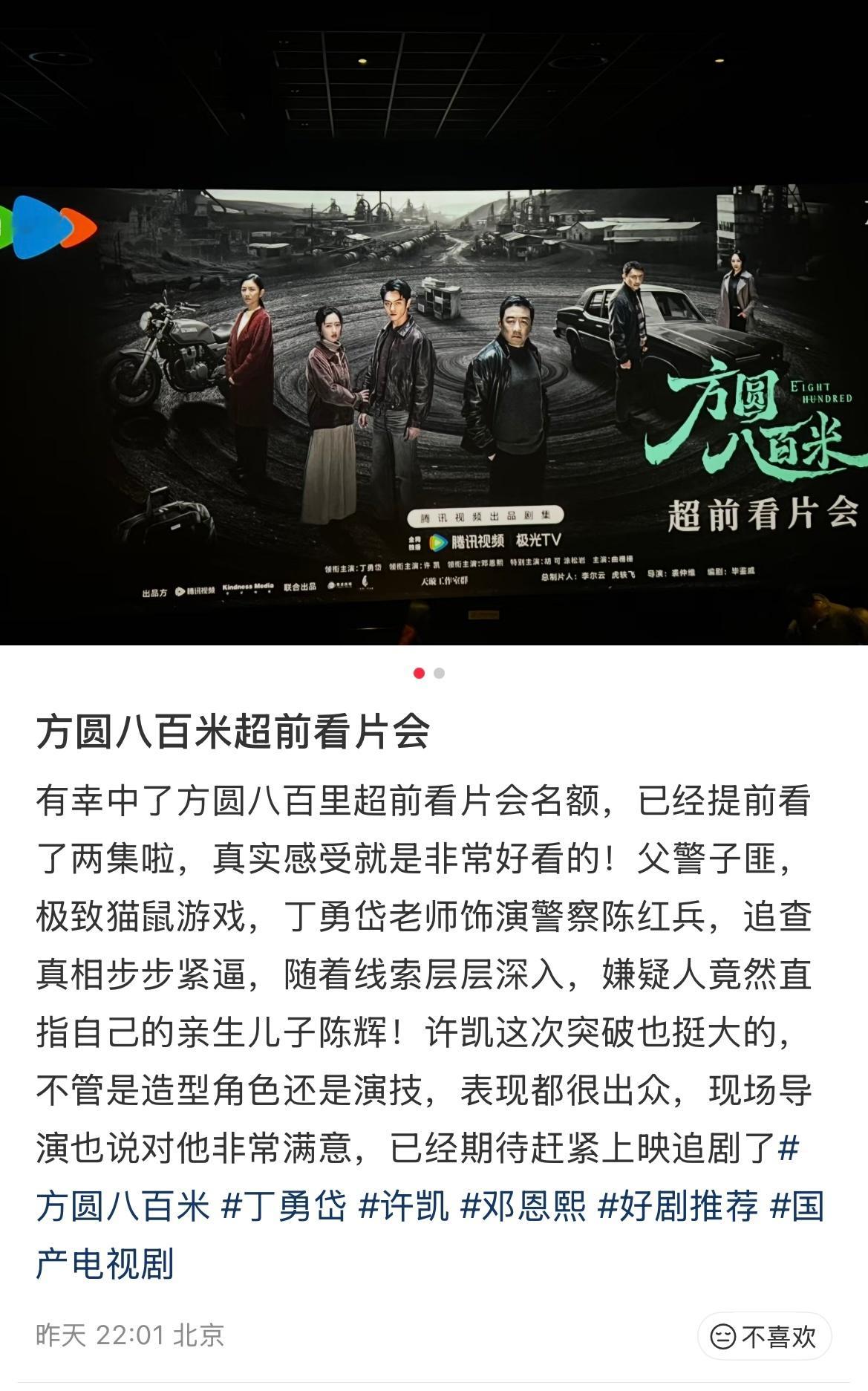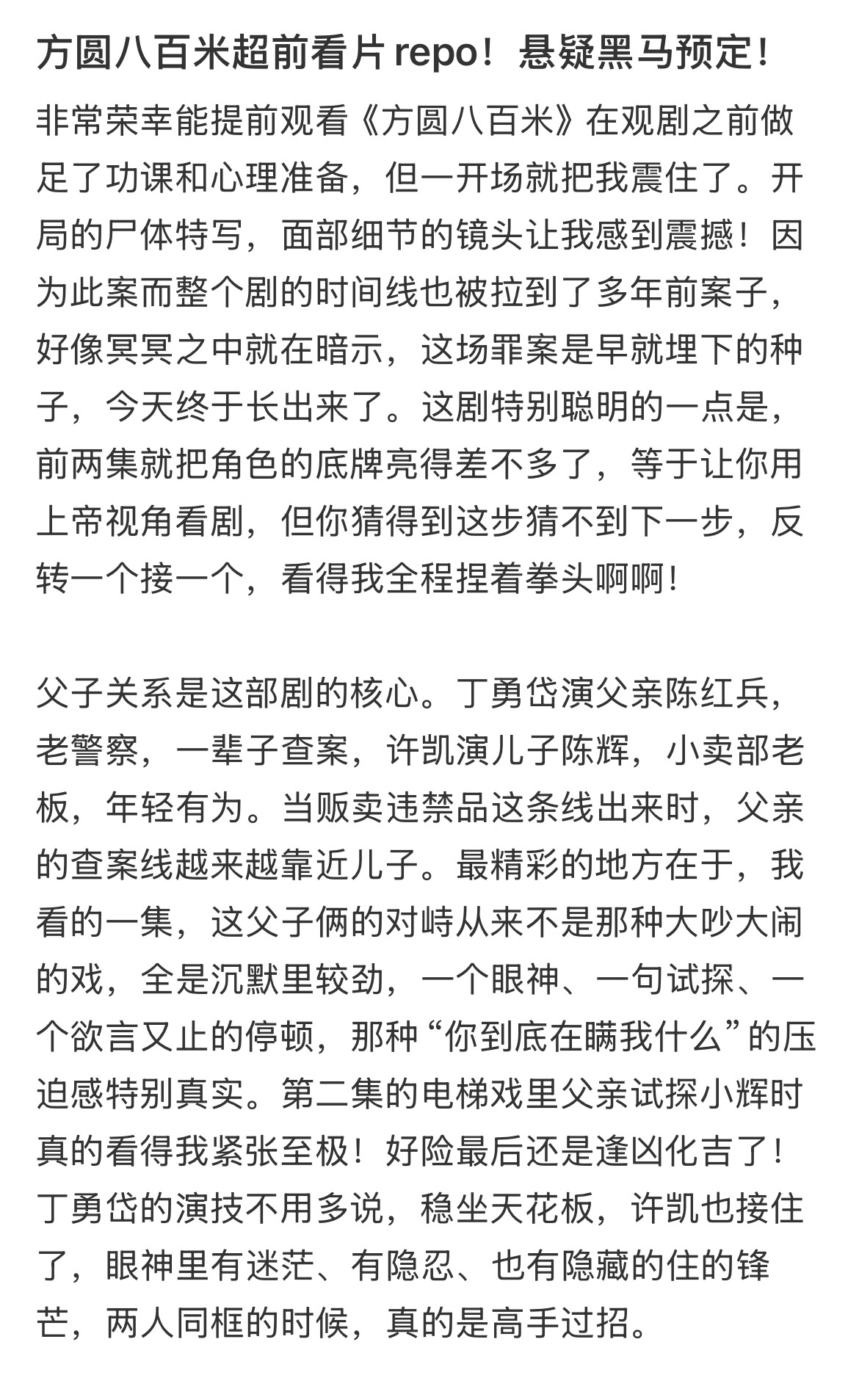 看了下方圆八百米超前观剧repo看起来大事很妙啊演员方面许凯突破很大,表现突出丁