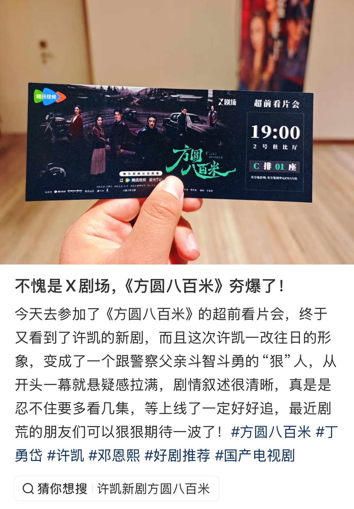看了下方圆八百米超前观剧repo看起来大事很妙啊演员方面许凯突破很大,表现突出丁勇岱老师一如既往的稳邓恩熙妹妹也很有反差剧情全程高能,如果能在下沉市场做好宣发,也许是小黑马