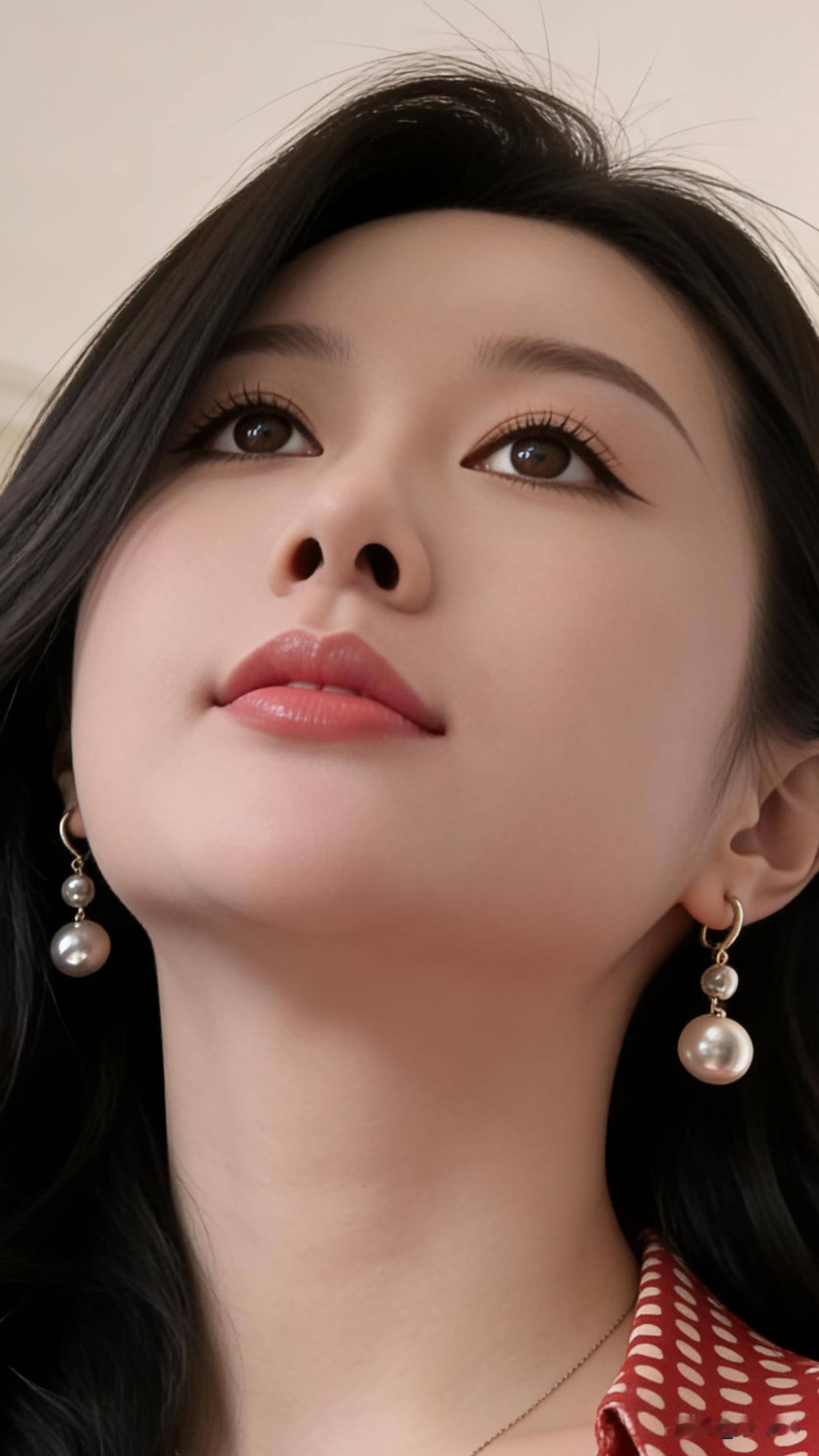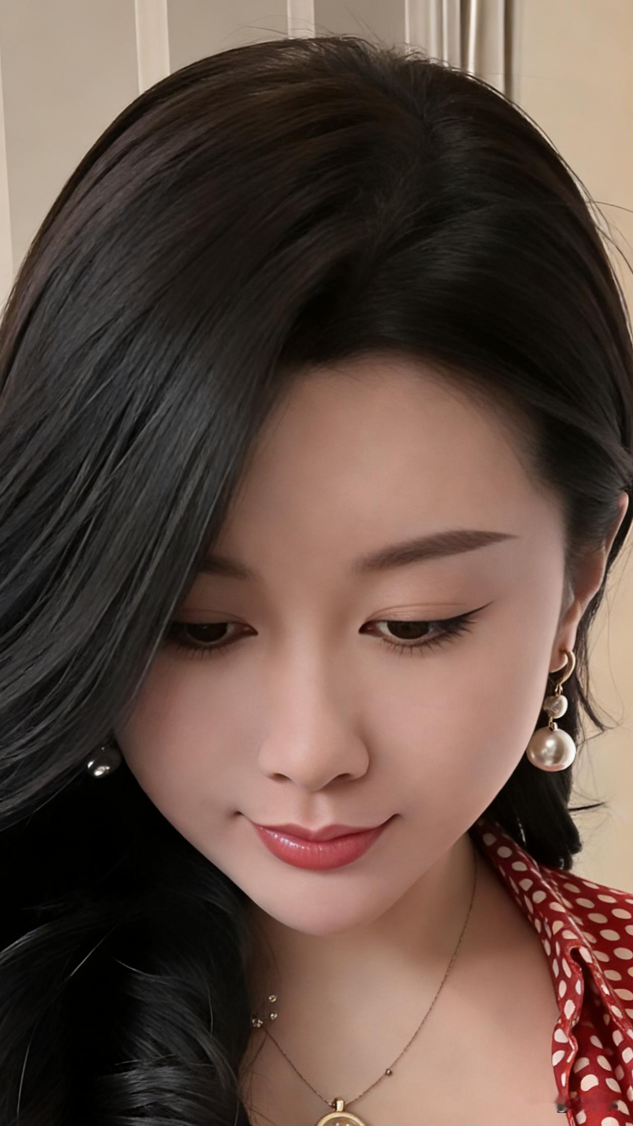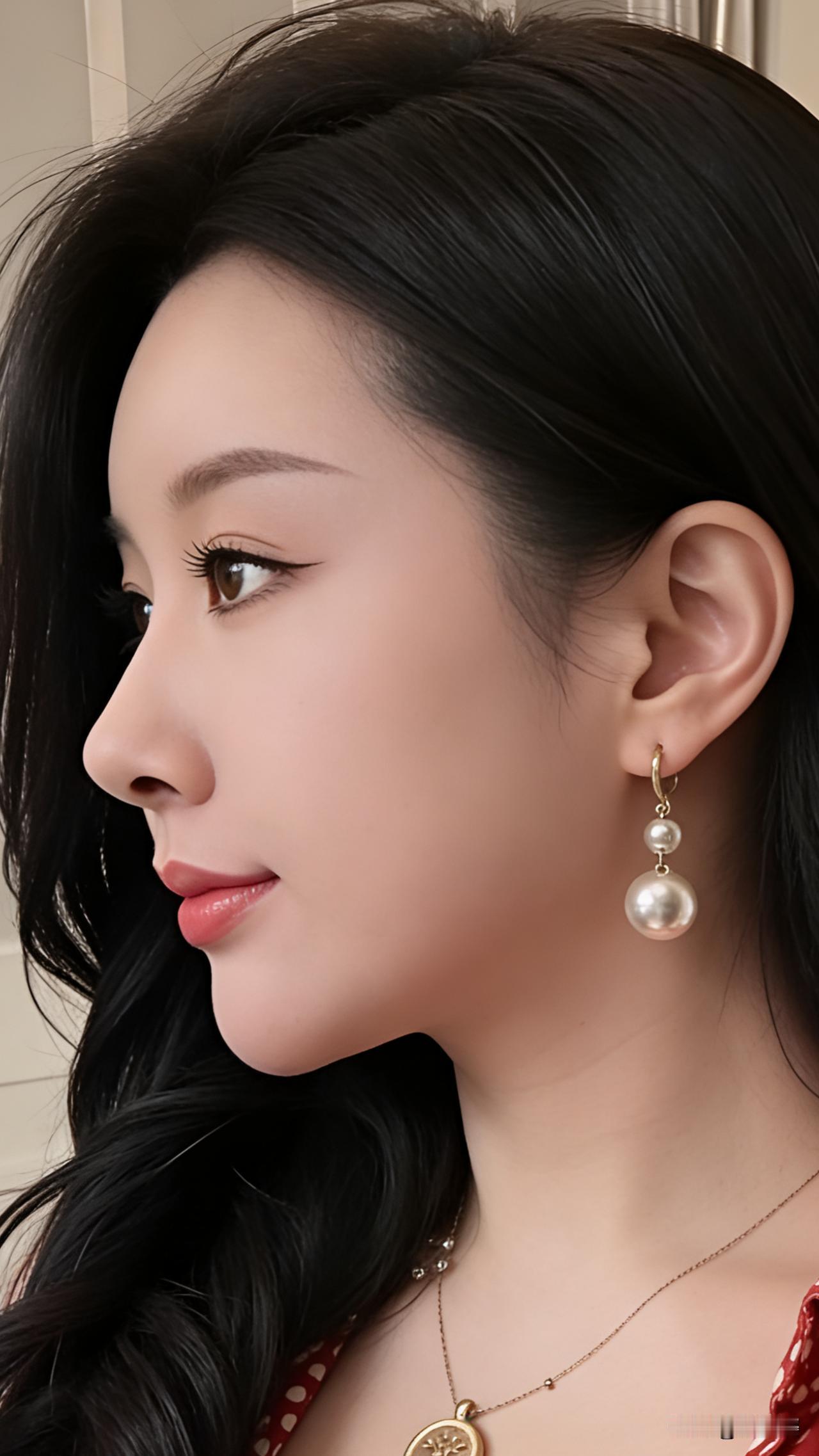 优雅气质,珍珠耳环点缀,红白波点裙装,尽显女性魅力。