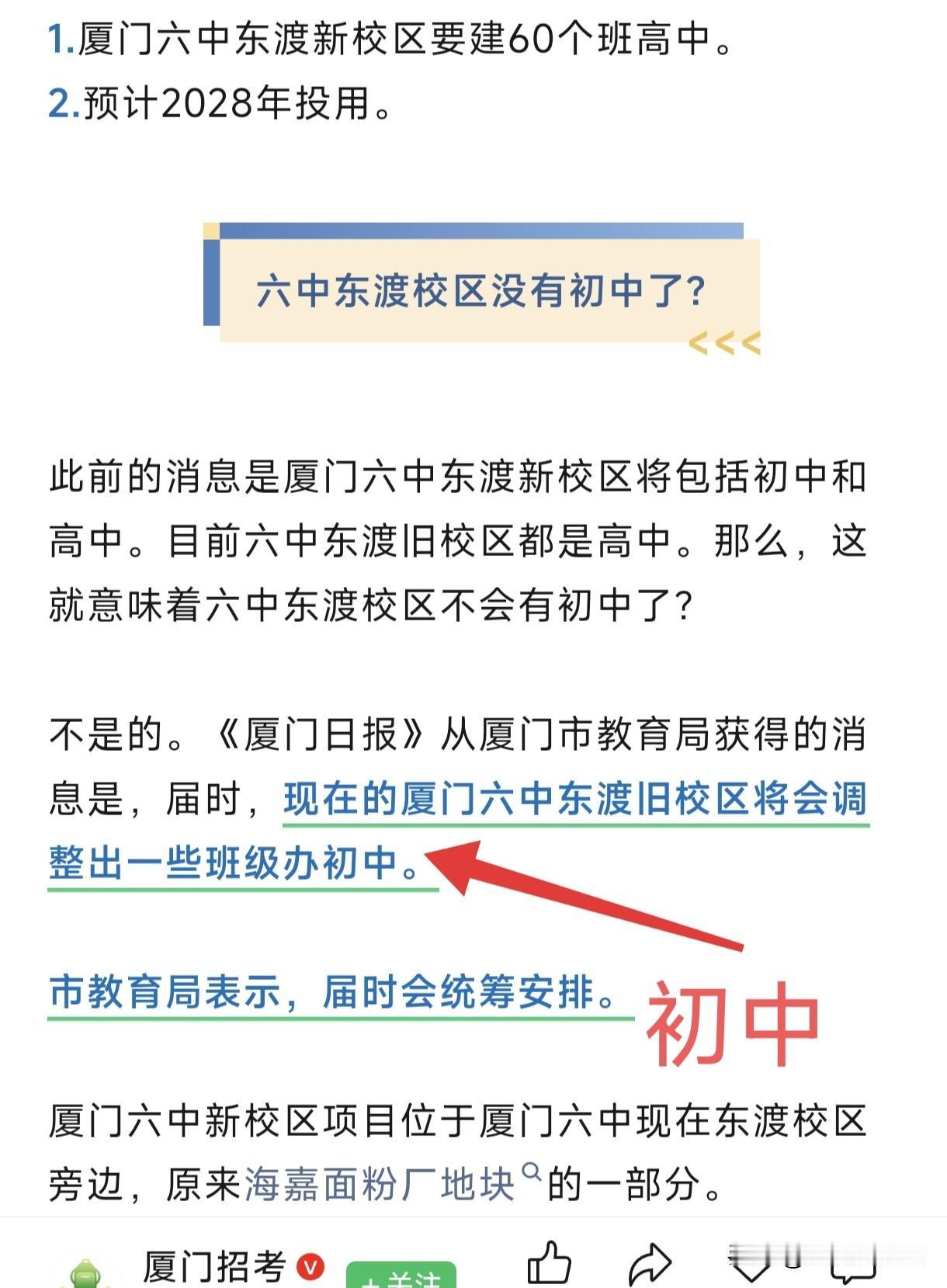 今天官方“厦门招考”更新了消息“整出一些班级办初中”,你可以理解为99.99%的几率将增设厦门六中东渡初中部。