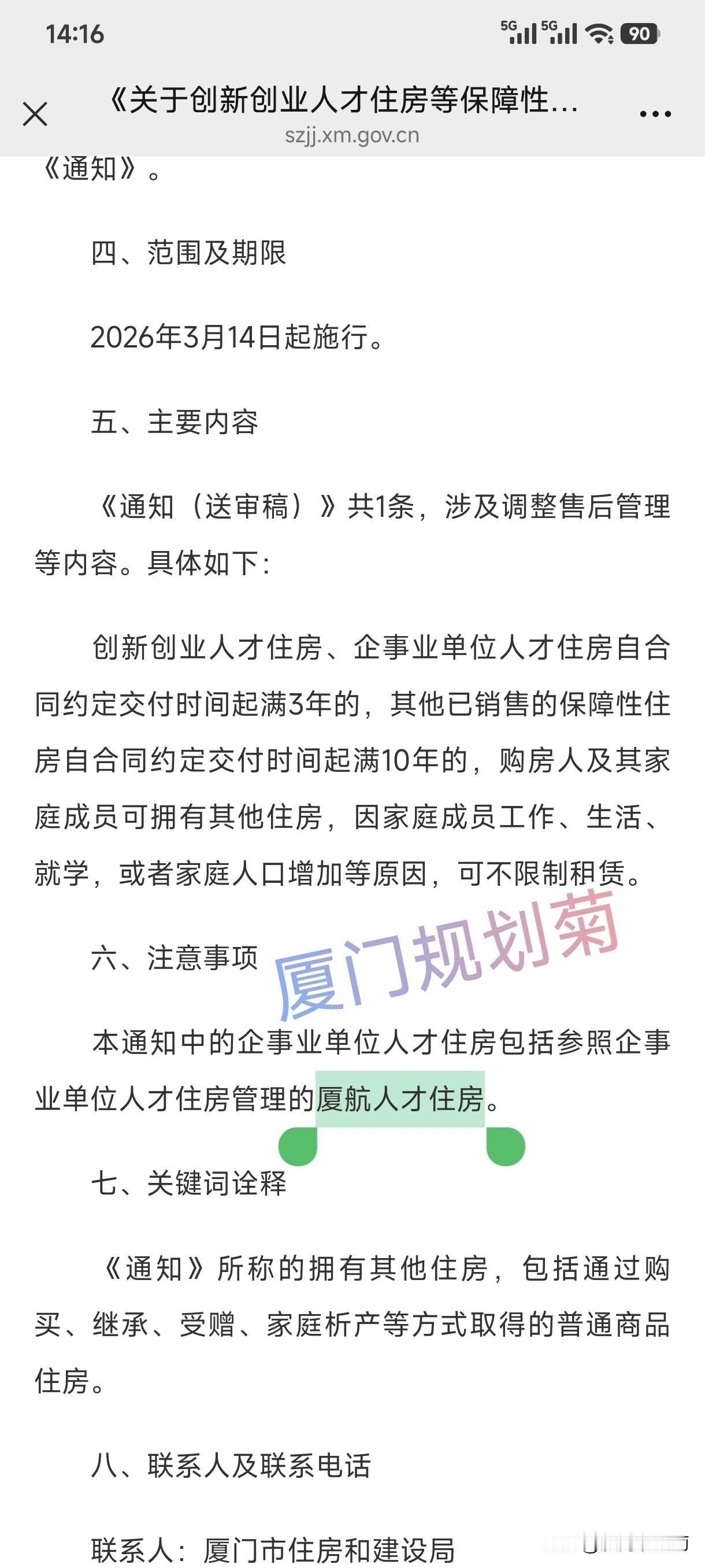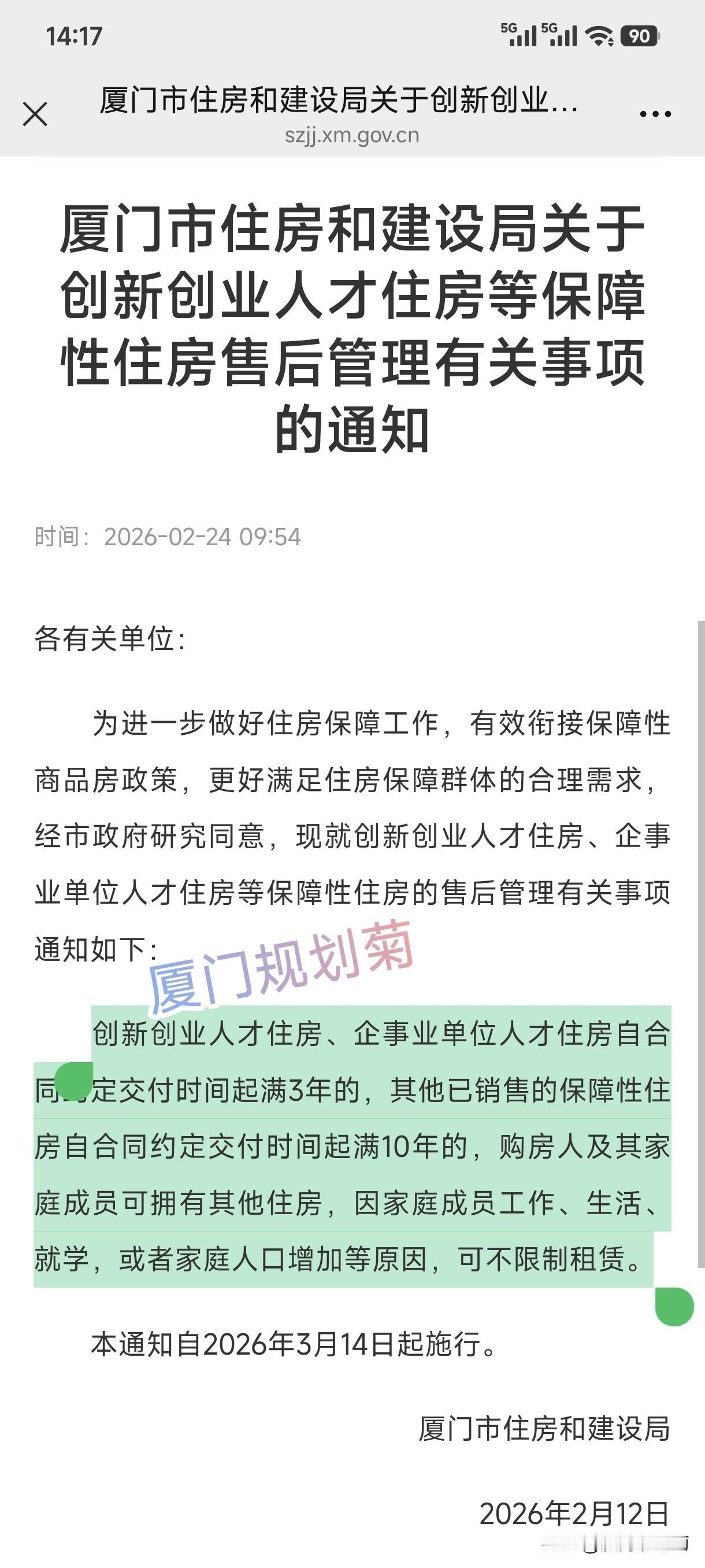 本月厦门市住房和建设局关于创新创业人才住房等保障性住房售后管理有关事项的通知,并且在今天2月27日单独发布关于此通知的政策解读明确包含厦航人才住房。