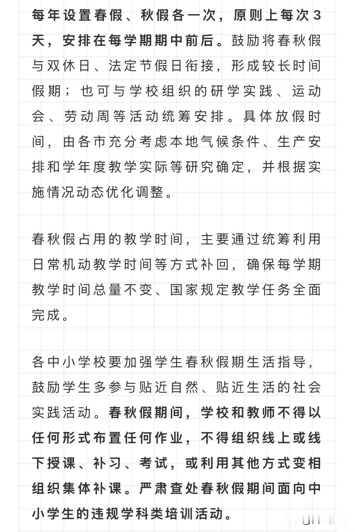山东教育厅已经下发文件,每年设置春假、秋假各一次,原则上每次3天,安排在每学期期中前后。