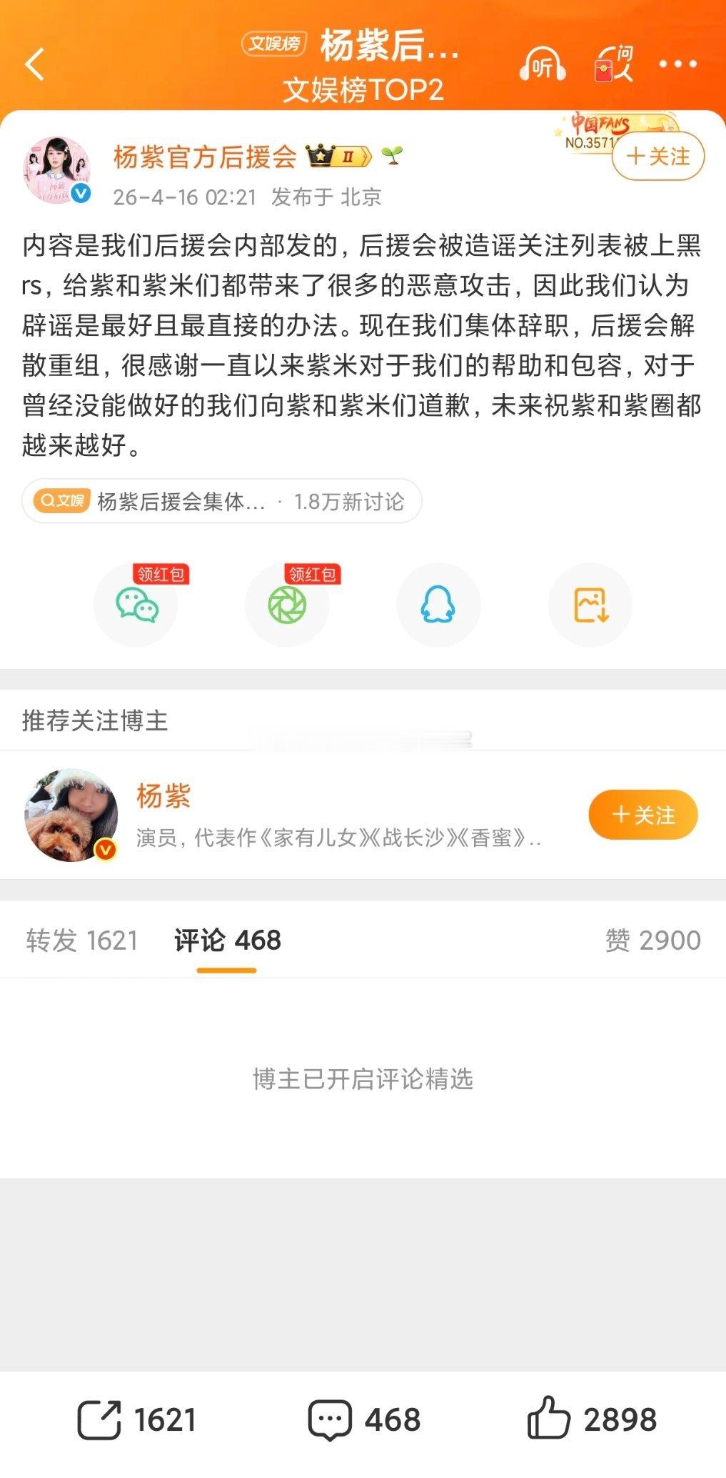 杨紫后援会删除了图1“关注个🥚 你也配?”,凌晨宣布所有成员集体辞职重组了杨紫后援会否认关注迪丽热巴超话