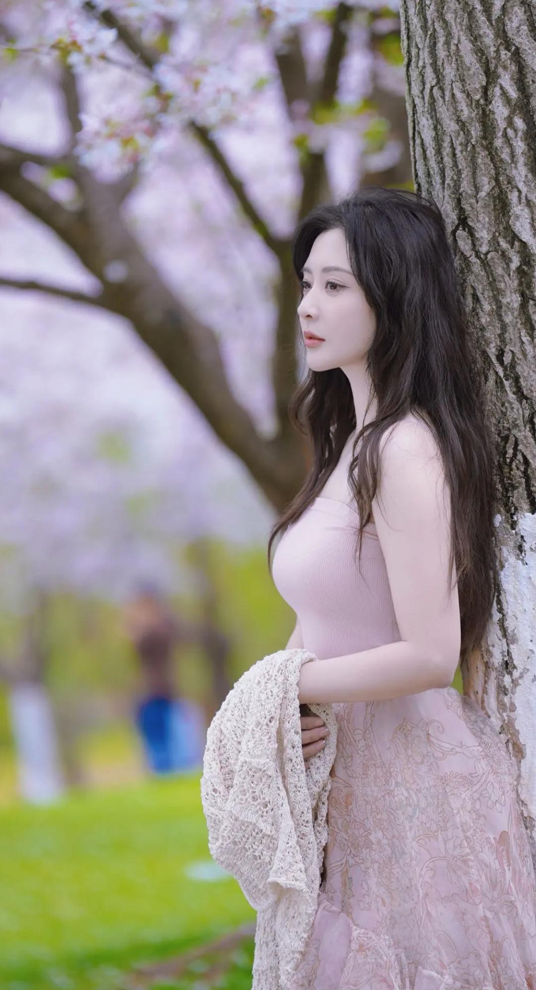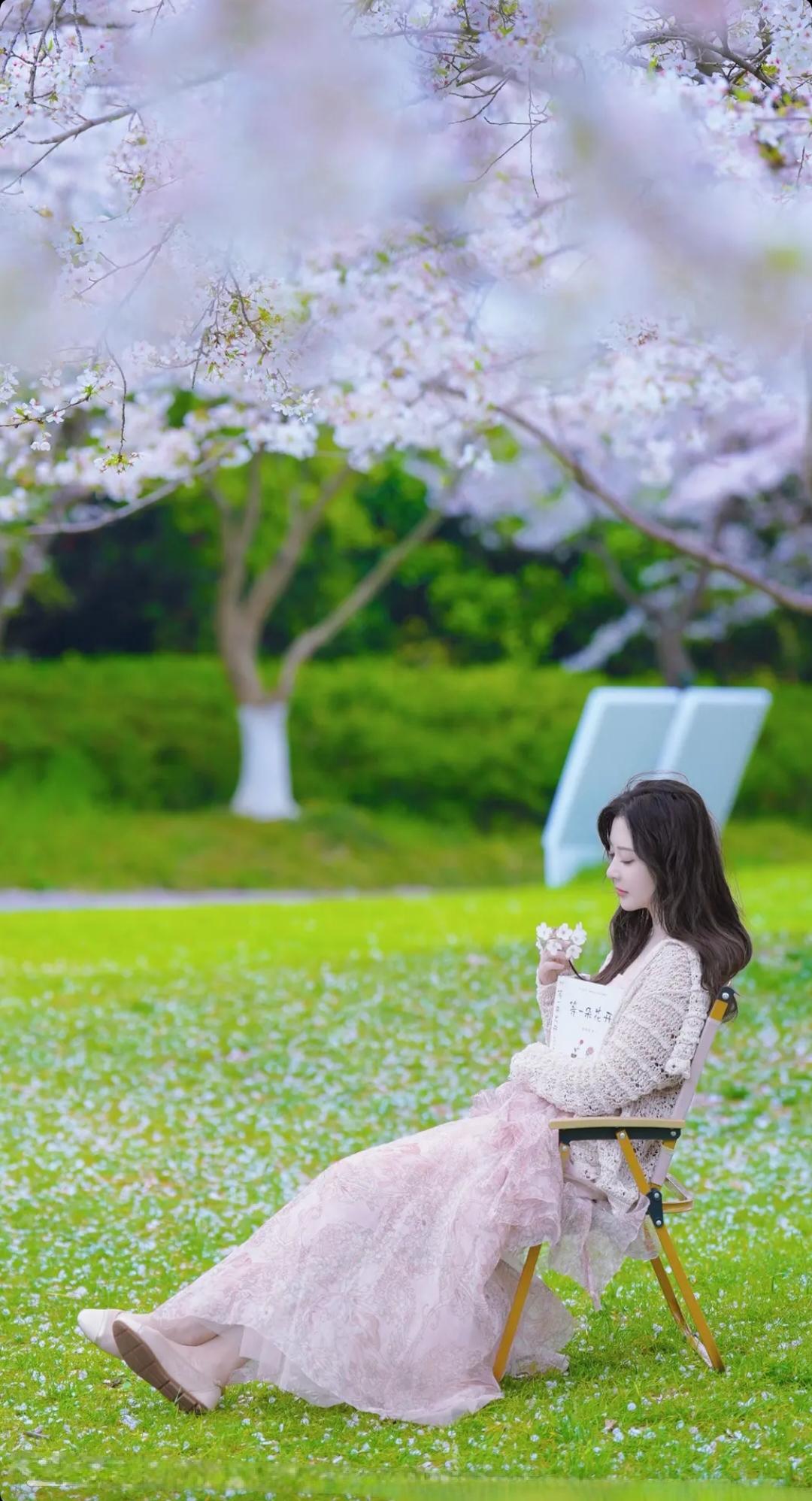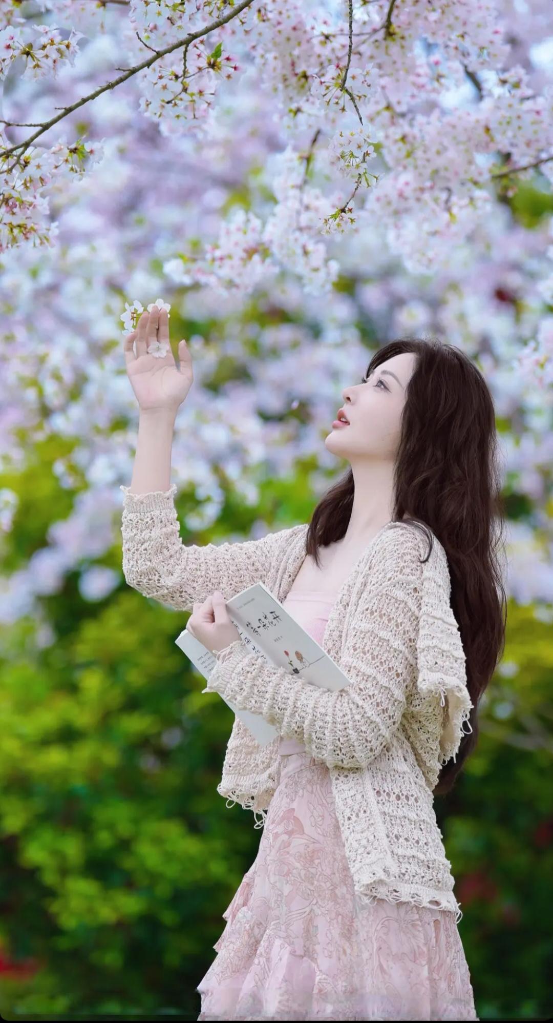 樱花树下,少女轻抚发梢,温柔如梦。
