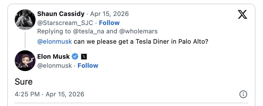 继洛杉矶首座餐厅营业后,马斯克确认,特斯拉将在北加州帕洛阿尔托新建一家特斯拉餐厅。