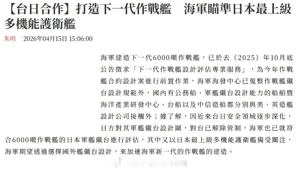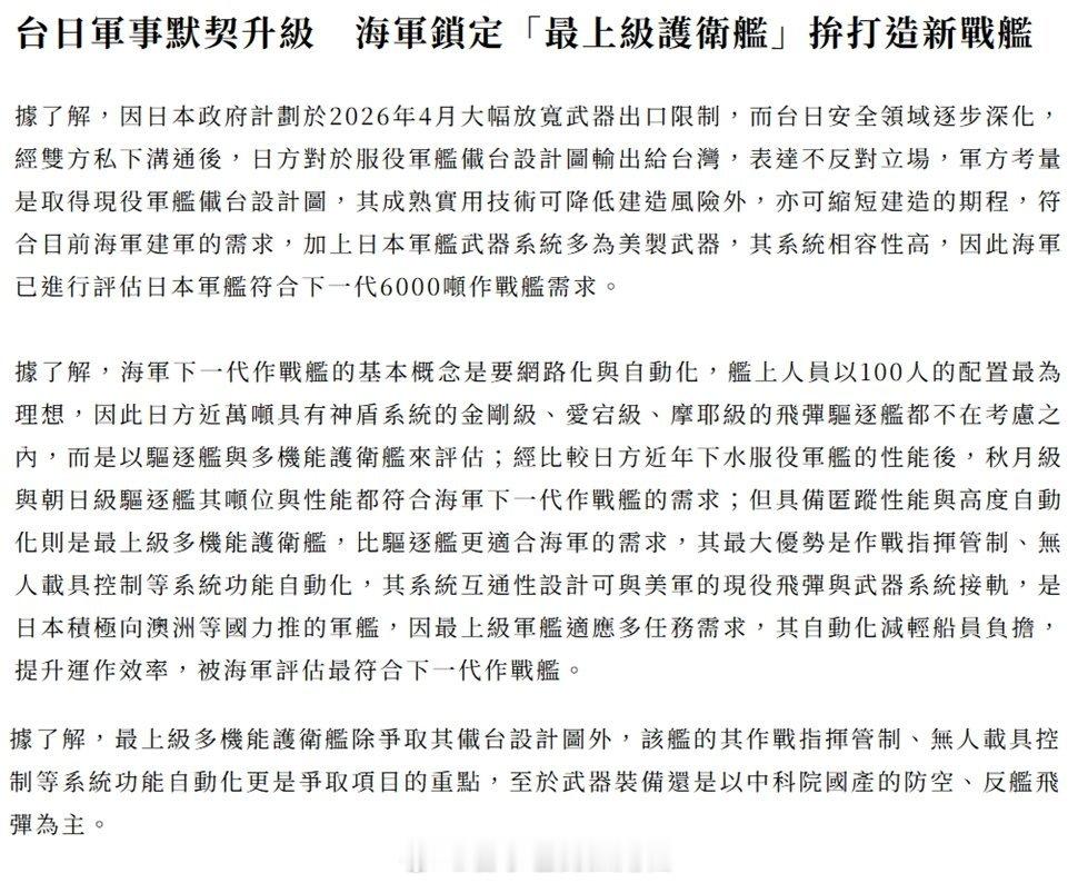 【台“神盾舰”可能以日本「最上」级为蓝本研制】中外舰闻烽火问鼎计划 图1、图2:2026年4月15日,台媒报道,台海军或已初步选定日本「最上」级护卫舰作为已于2025年内确认重启、更名为「戟海专案」的“新一代飞弹巡防舰”项目的设计蓝本。月内即将全面解禁武器出口政策的日本就对台出口舰艇设计方案一事持默许态度,台海军则对日本「最上」级护卫舰的隐身性能、自动化性能与无人装备运用性能以及与美制舰载子系统的兼容性表示认可。