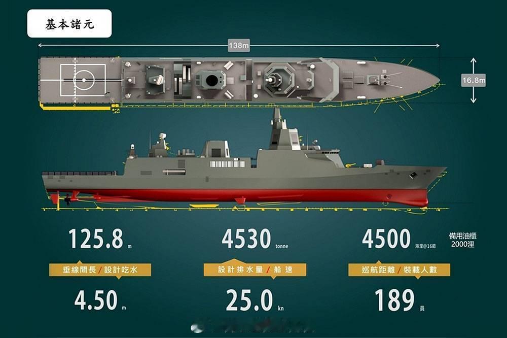 图4、图5:2022年宣告中止的、当时名为「震海专案」的“新一代飞弹巡防舰”概况;因设计体量(满载4500吨级)过小难以整合台“中科院”自主设计的S波段相控阵雷达(图6),尽管台“中科院”和台海军先后提出改用小型轻量化的X波段相控阵雷达或改为全面引进外国子系统(舰体自造+战系委外),但仍无法改善进度大幅延宕的情况,项目遂于2022年取消,已拨付预算改为建造两艘“轻型巡防舰”(图7:防空型、图8:反潜型)。2025年8月,台当局领导人赖清德在视察台海军部队时宣布重启“新一代飞弹巡防舰”项目,重启后的项目更名为「戟海专案」,体量也扩大至满载6500吨级,现已进入合约设计阶段。
