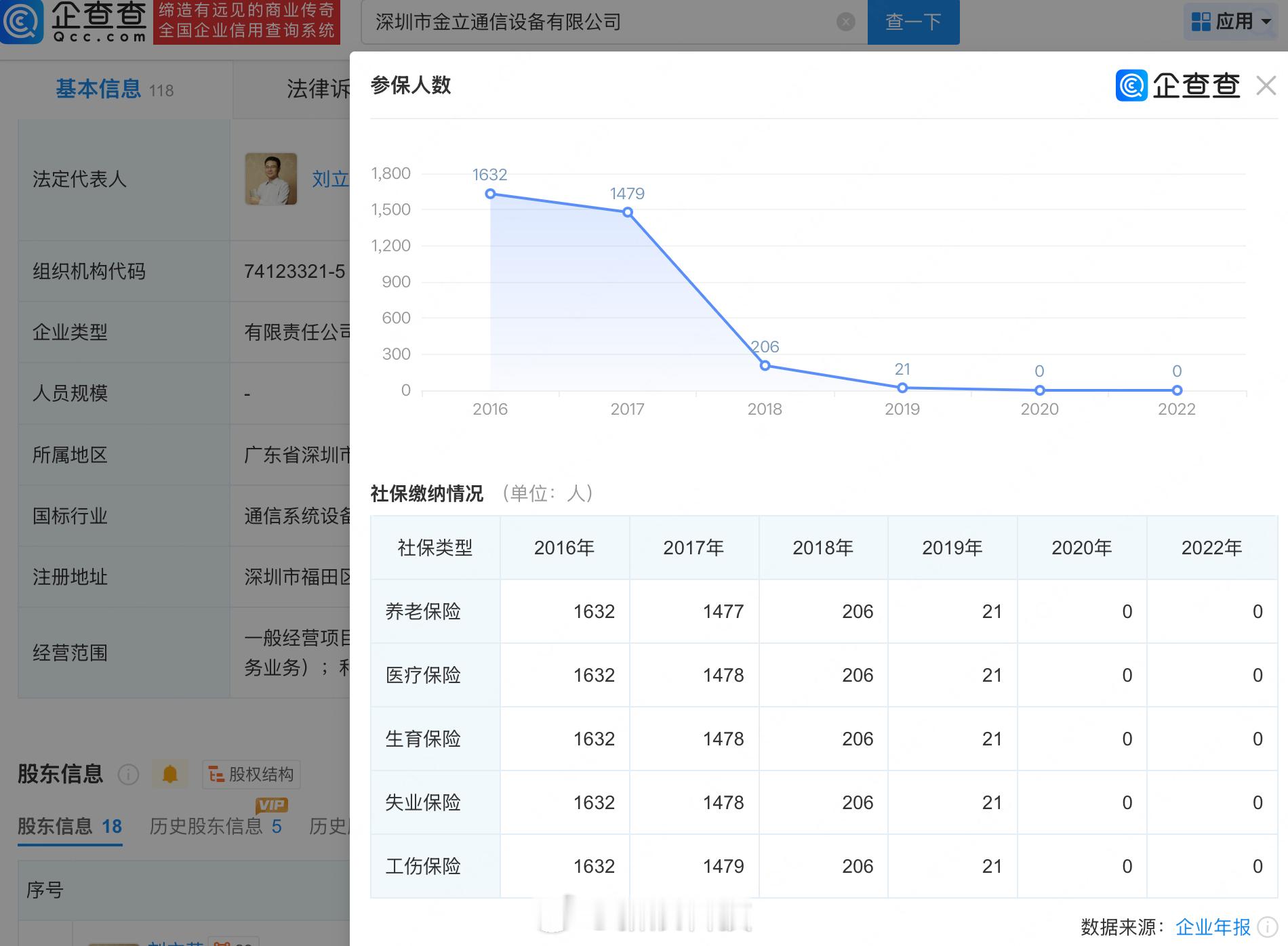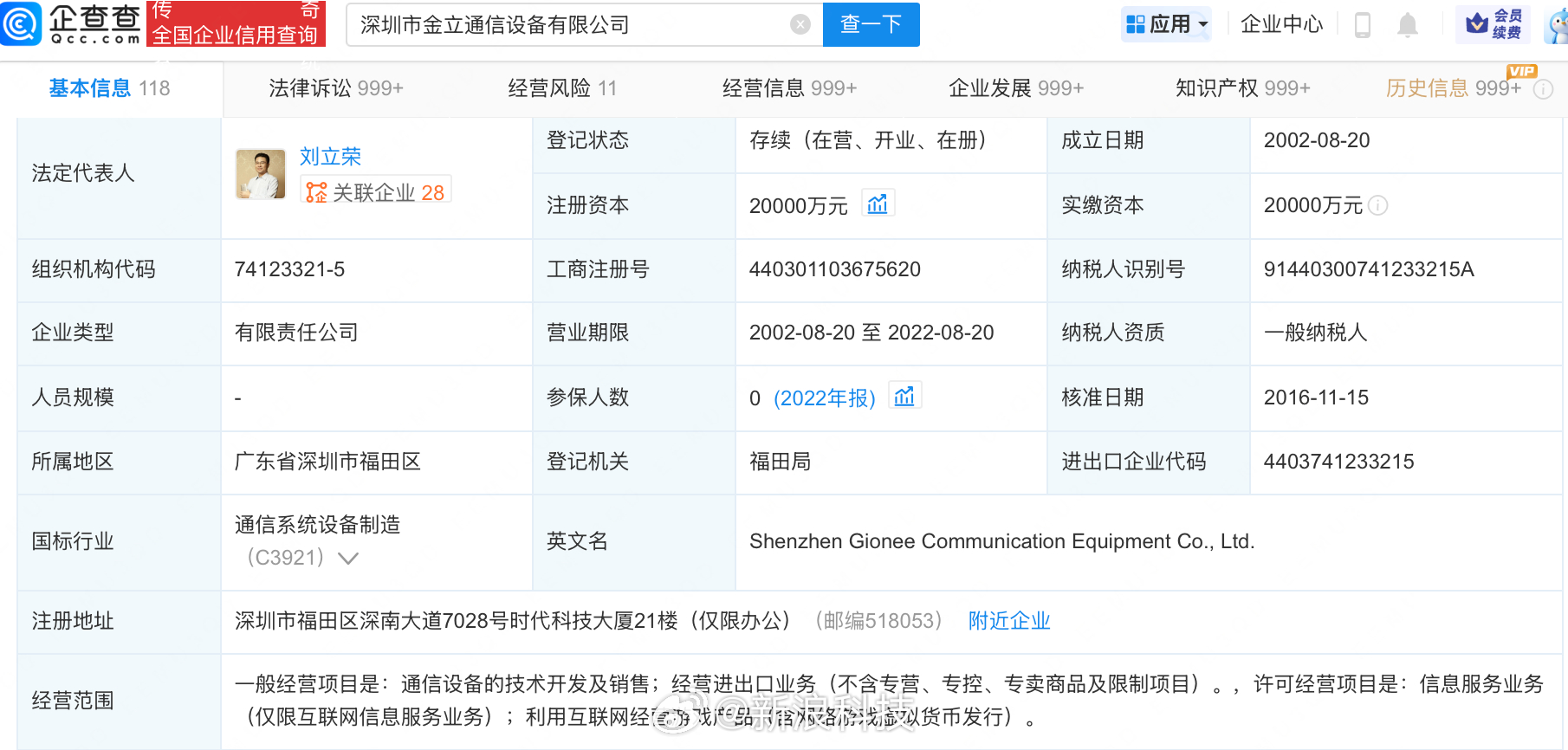 企查查APP显示,刘立荣目前仍担任深圳市金立通信设备有限公司法定代表人及董事长等职务,该公司成立于2002年,注册资本2亿元。年报信息显示,该公司2016年参保人数1632人,后逐年下滑,于2019年降至21人、2020年降至0人。金立手机创始人曾赌博输掉十几亿