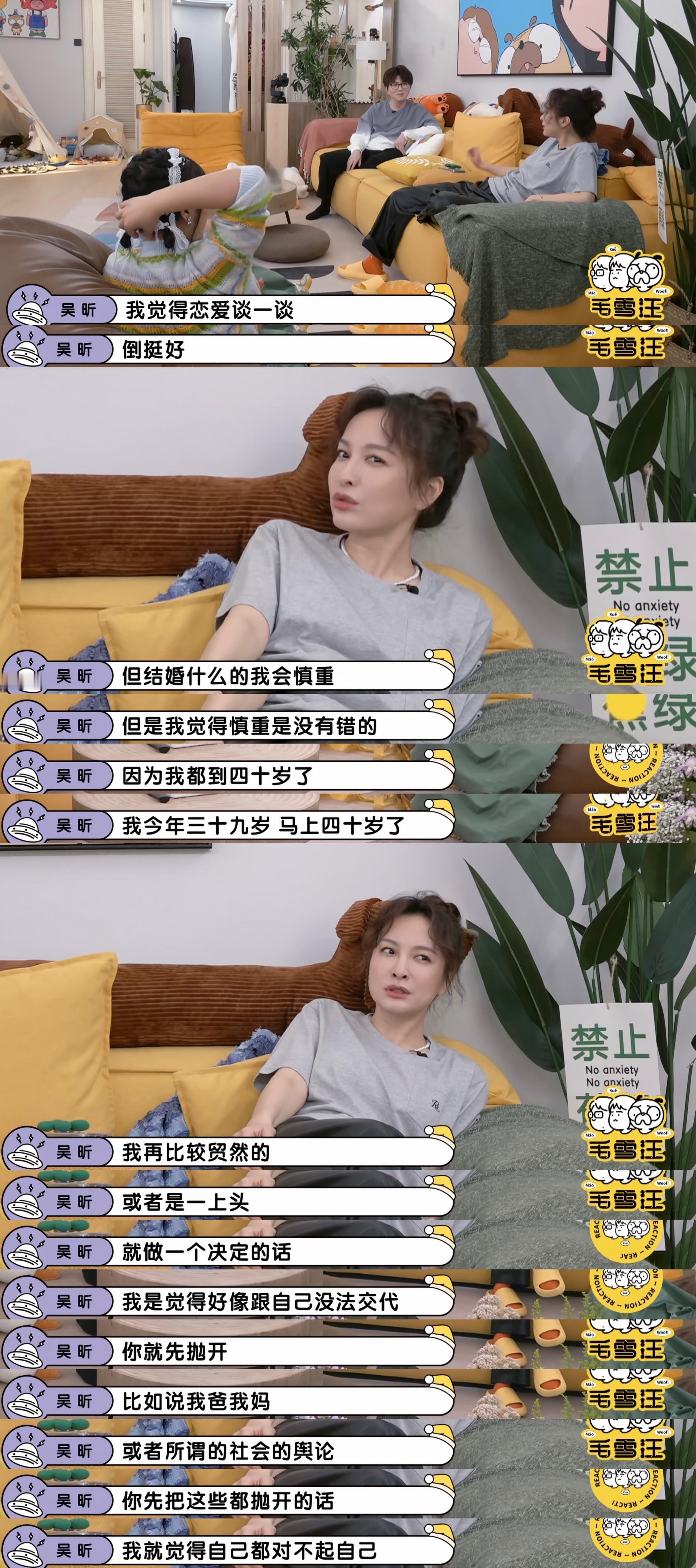当时吴昕也说,恋爱可以谈谈,但是结婚要慎重,毕竟四十岁了,贸然做决定没法给自己交代。