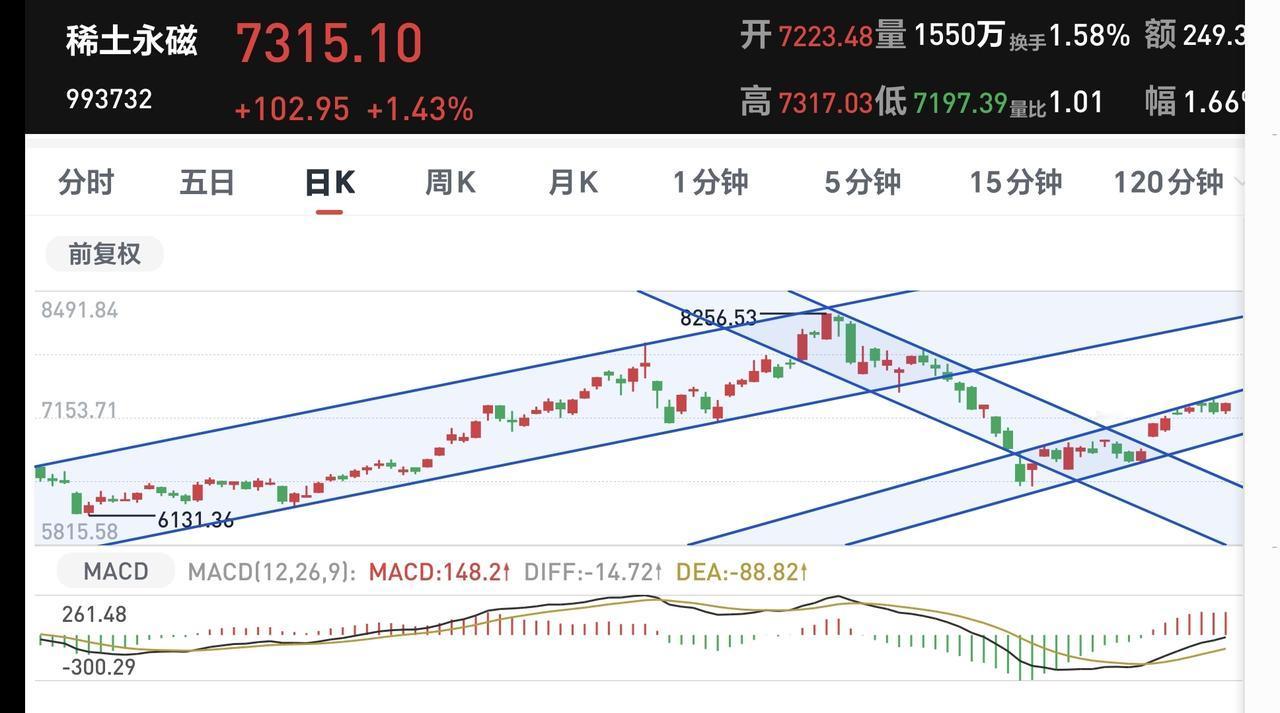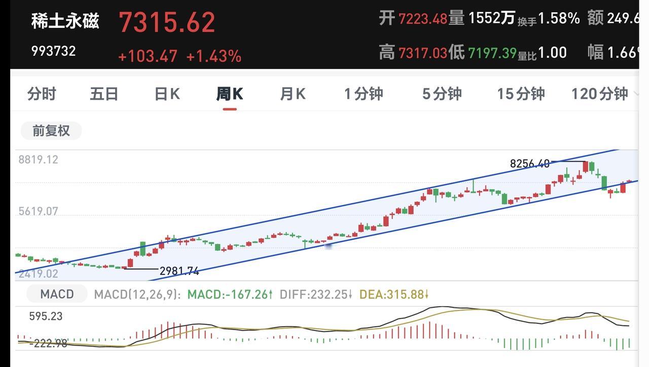 稀土永磁板块前段时间下跌跌破了周线级别上涨通道的下轨线,本周又上涨回到了这个上涨通道内,又重新回到了周线级别的上涨趋势中,只要能够保持在这个上涨通道下轨线的上方,长线持有的人都可以继续持有。