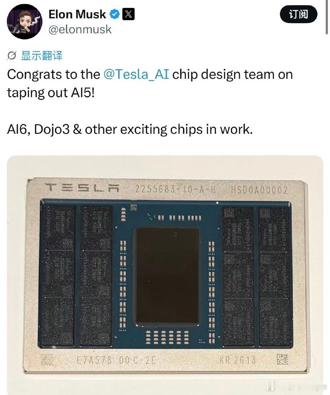 特斯拉大涨原因特斯拉AI5芯片流片特斯拉自研AI5新芯片太猛HW4碾压?AI5算力2000+TOPS,算力5倍、内存9倍,智驾FSD/出租车Robotaxi/机器人Optimus都能用,智驾FSD起飞!汽车资讯新能源汽车大v聊车新品驾到数码闲聊站特斯拉