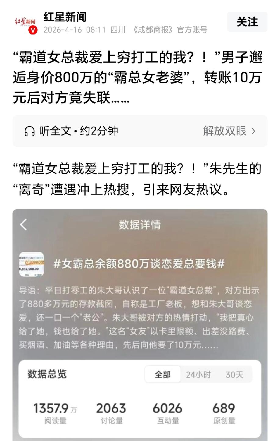 短剧看多了!务工男子在网上邂逅了霸道女总裁,对方表示她卡里有800万,就想找个真心人恋爱,还对男子各种甜言蜜语,男子幸福的坠入爱河。后来,女子以银行卡限额,出差急需钱为由向男子求助,男子主动给她转账10万元,没想到,钱转了,女总裁却失联了。