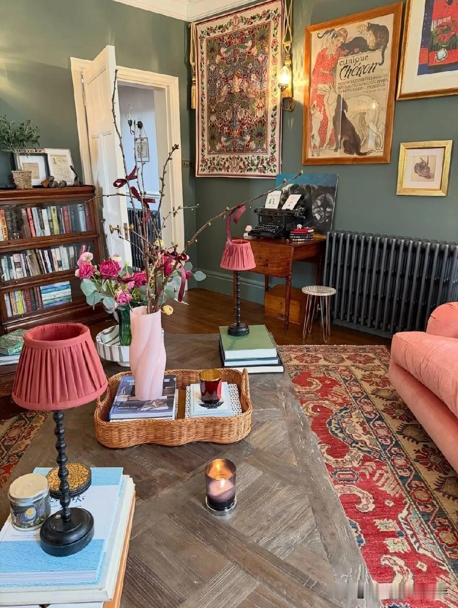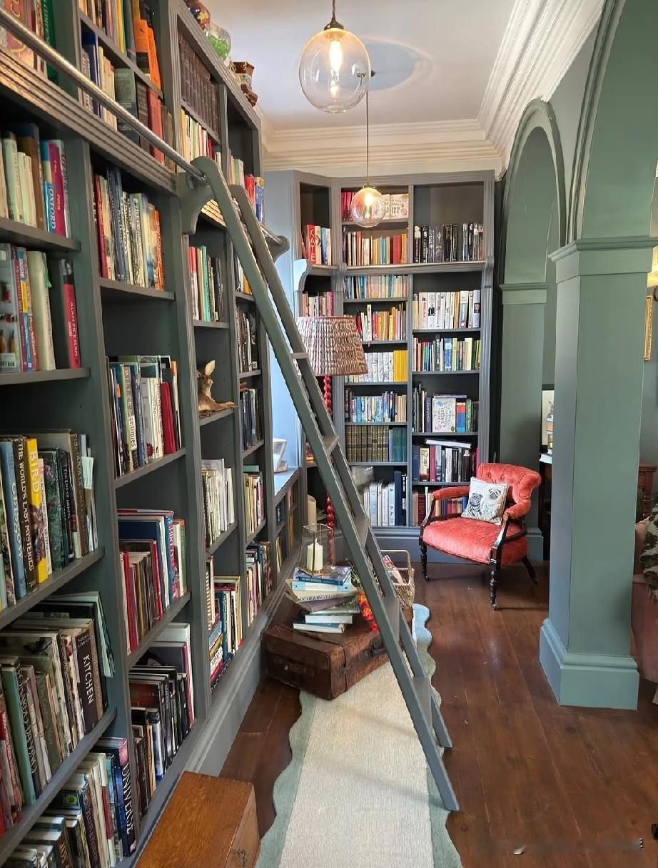 最近超火的英式复古图书馆风格,采用双拱形门洞和石膏线吊顶,实木人字拼地板,搭配红底波斯风地毯,满墙书架,沉浸式图书馆既视感。