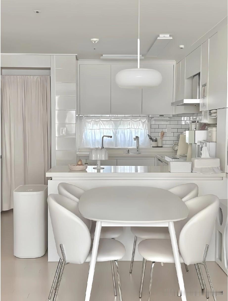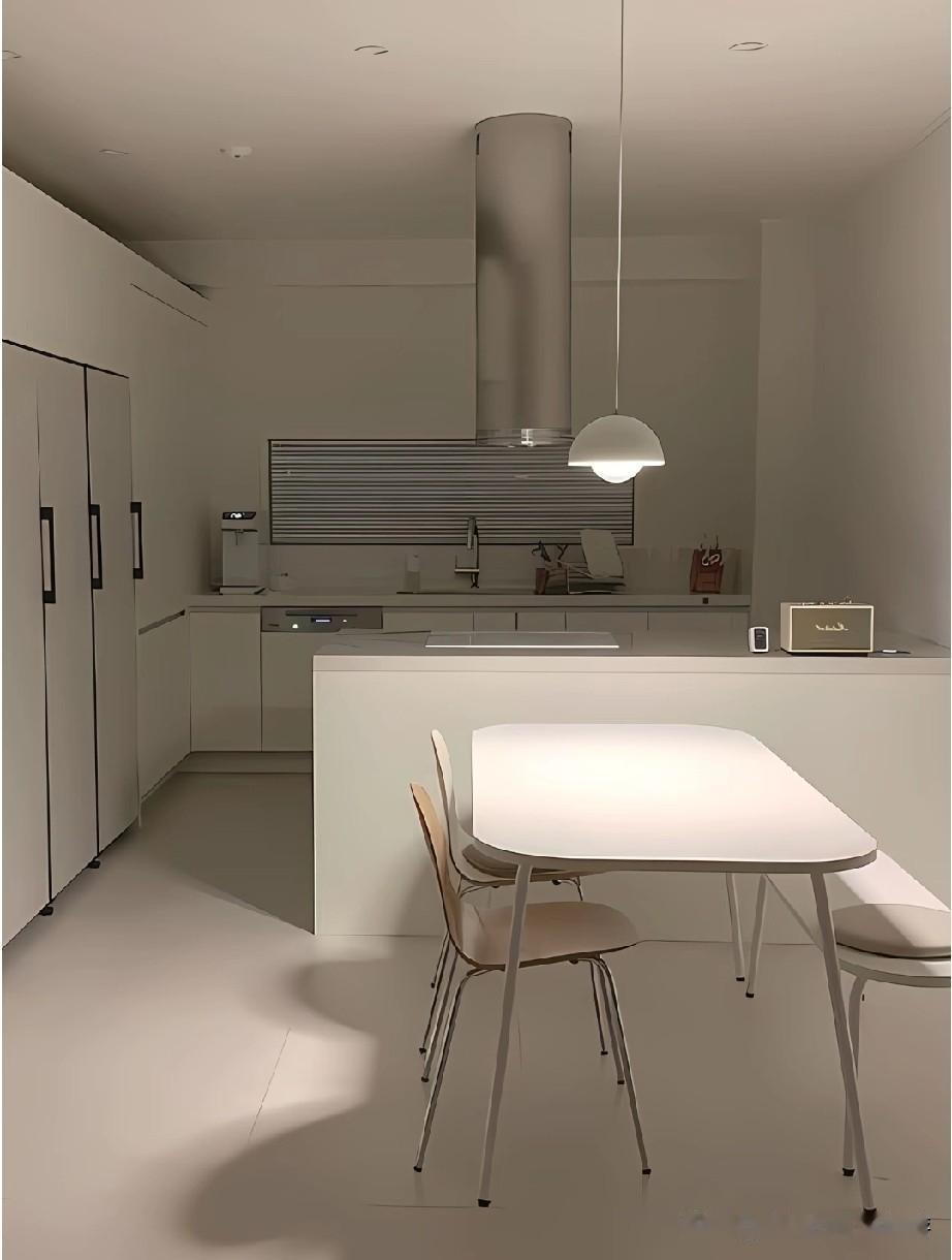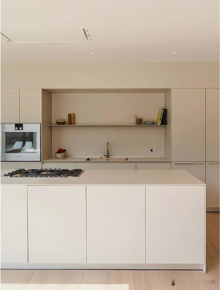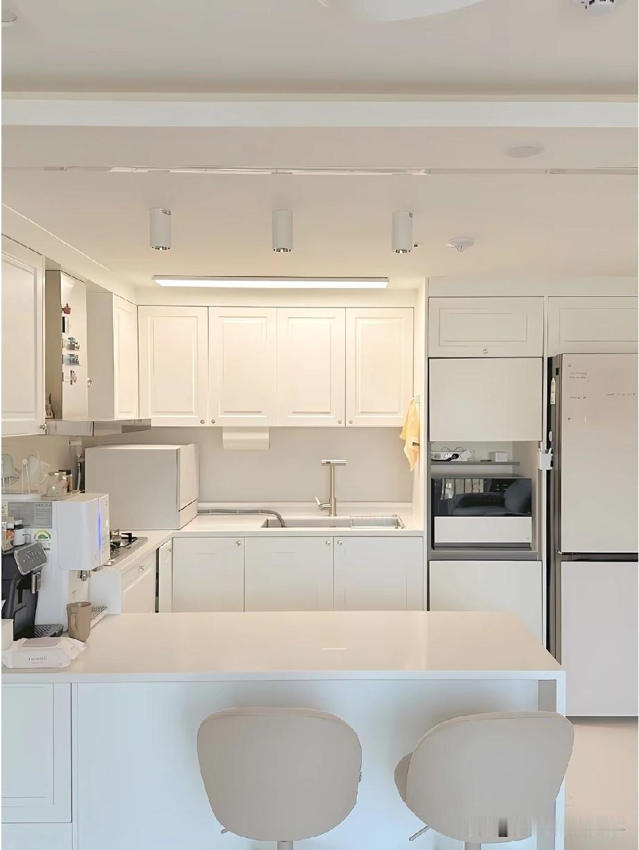 韩国厨房之所以总让人觉得精致高级,很大程度来自整体审美的统一感。空间里很少出现杂乱的元素,色彩控制在低饱和范围内,常见米白、浅灰、奶油色搭配原木或石材,视觉干净柔和。橱柜、台面、电器之间几乎没有突兀的边界,线条利落,让人一眼看过去就很舒服。