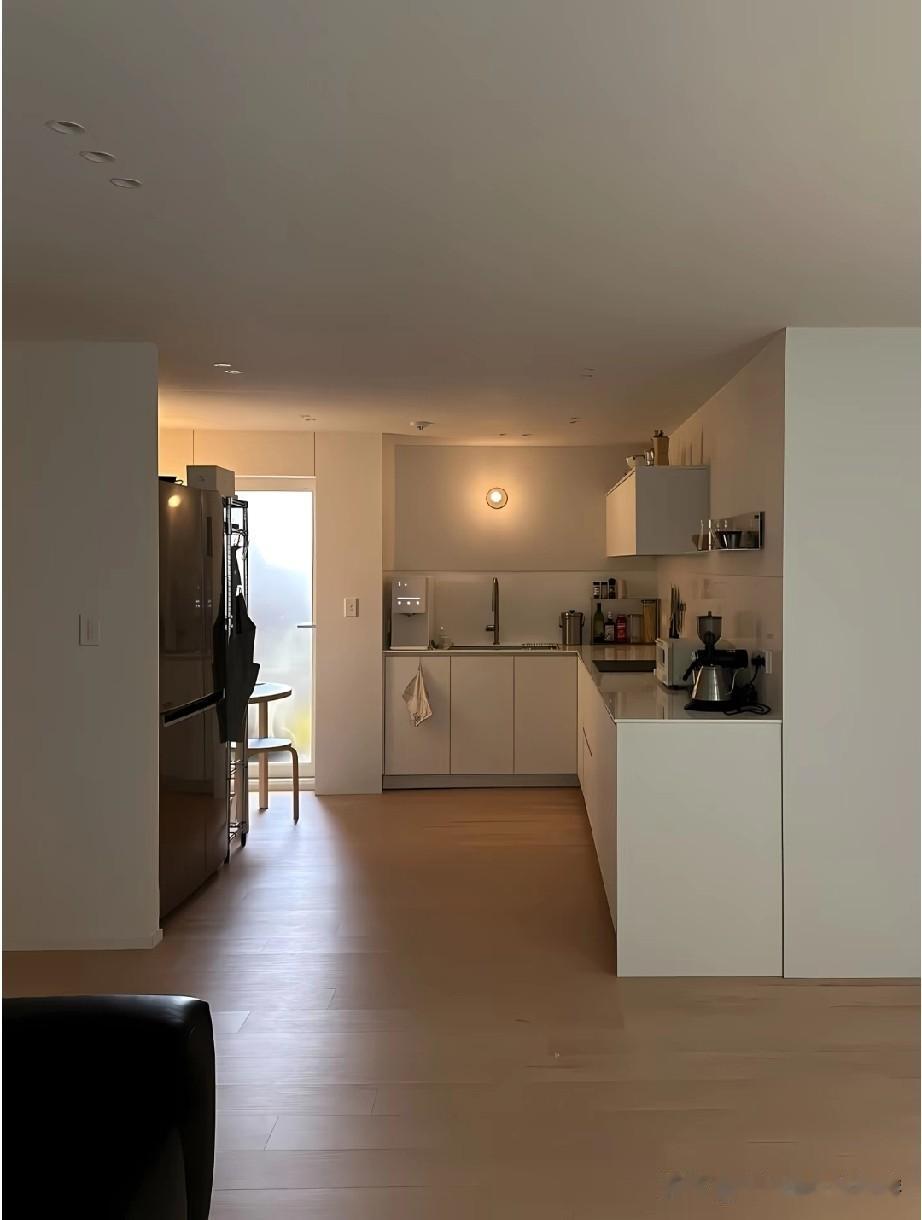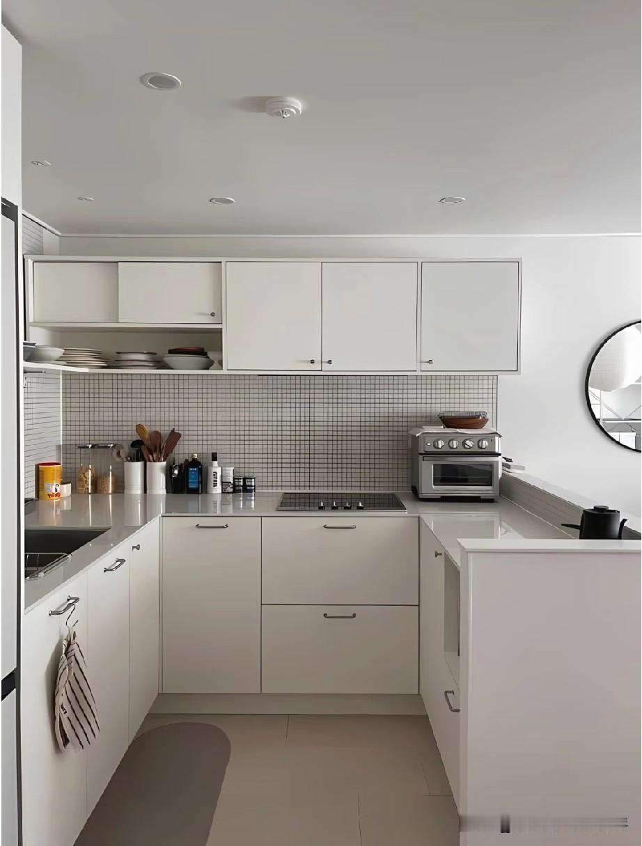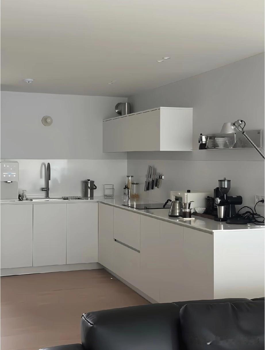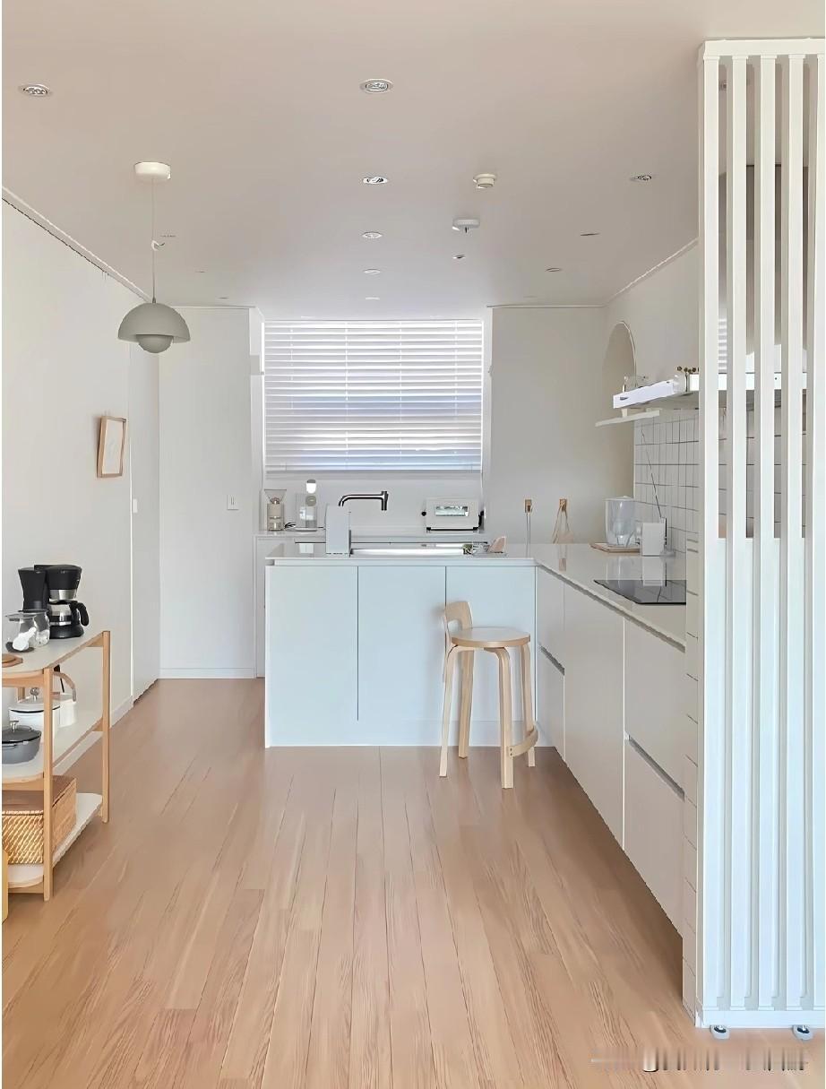 韩国厨房之所以总让人觉得精致高级,很大程度来自整体审美的统一感。空间里很少出现杂乱的元素,色彩控制在低饱和范围内,常见米白、浅灰、奶油色搭配原木或石材,视觉干净柔和。橱柜、台面、电器之间几乎没有突兀的边界,线条利落,让人一眼看过去就很舒服。