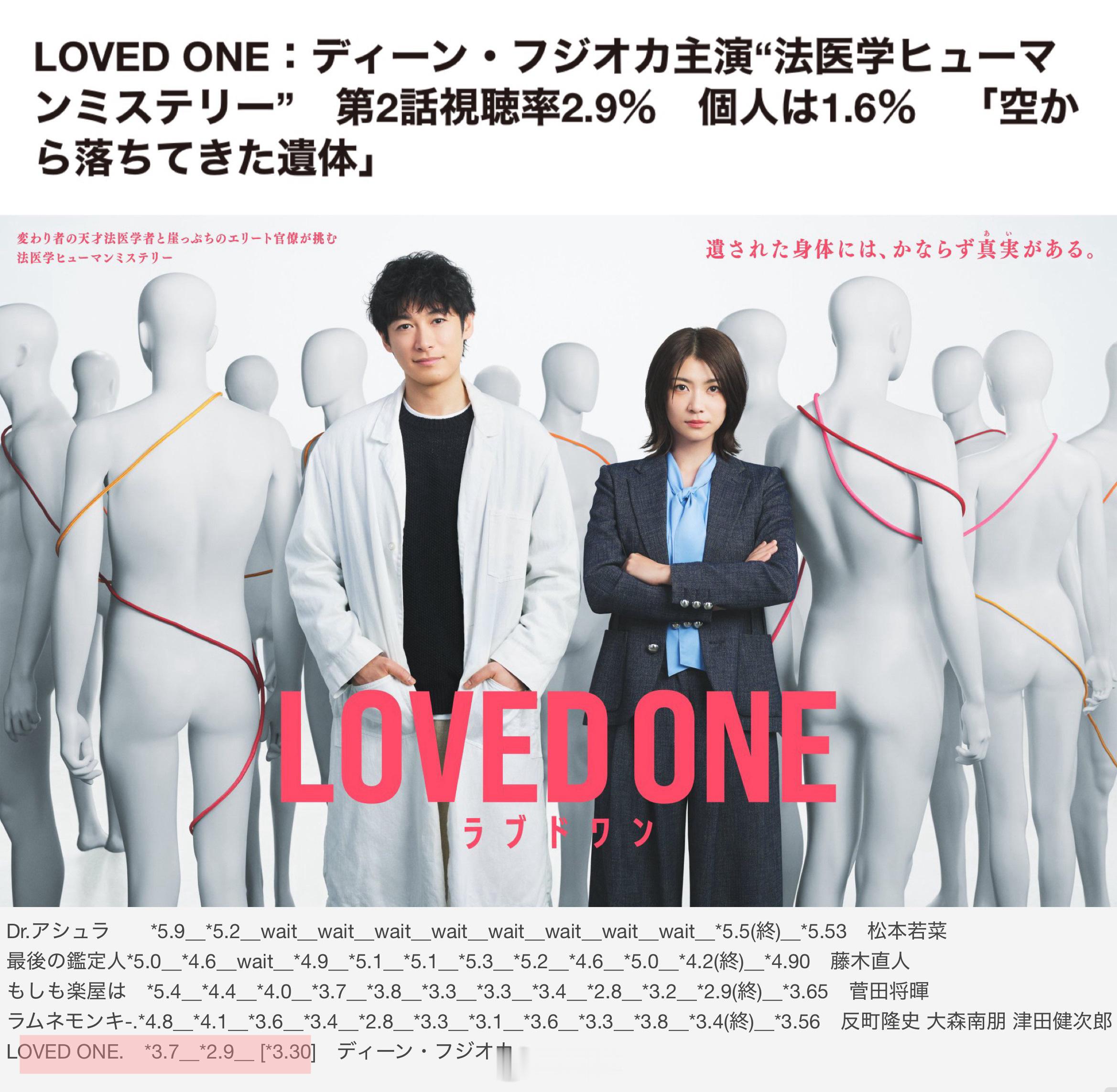 本周已跌破3演员藤冈靛担任主演的富士台水10连续剧『LOVED ONE』第2集于4月15日播出,据Video Research调查,平均世代收视2.9%、个人1.6%。
