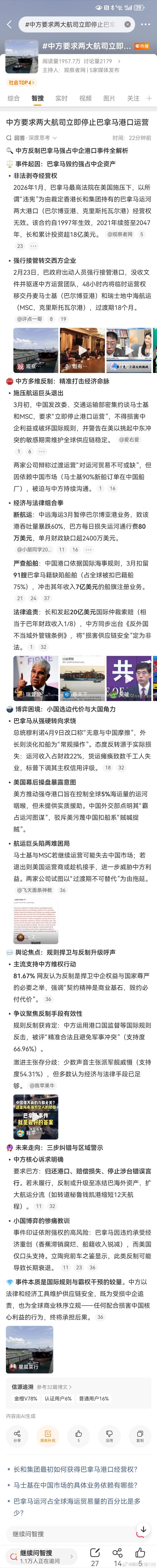 中方要求两大航司立即停止巴拿马港口运营不能让小国欺负大国成为习惯,更不能容忍这样的事情一再发生,而不采取一点有威慑力的行动。流氓国家的坏习惯,都谦谦君子大国克制忍让,给惯出来的臭毛病。该出手时不出手,会被人视为懦弱可欺。老虎不发威,会让人以为你是病猫。打得一拳开,免得百拳来,这道理放在任何时候,都是经典。