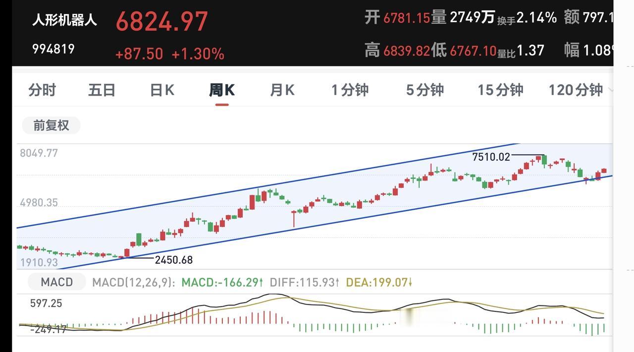 机器人板块周线级别处于上涨通道中,距离上涨通道的下轨线比较近,近期观察是在这里继续反弹向上,还是会跌破这条下轨线,如果有效破位这条下轨线,长线的人需要注意风险。