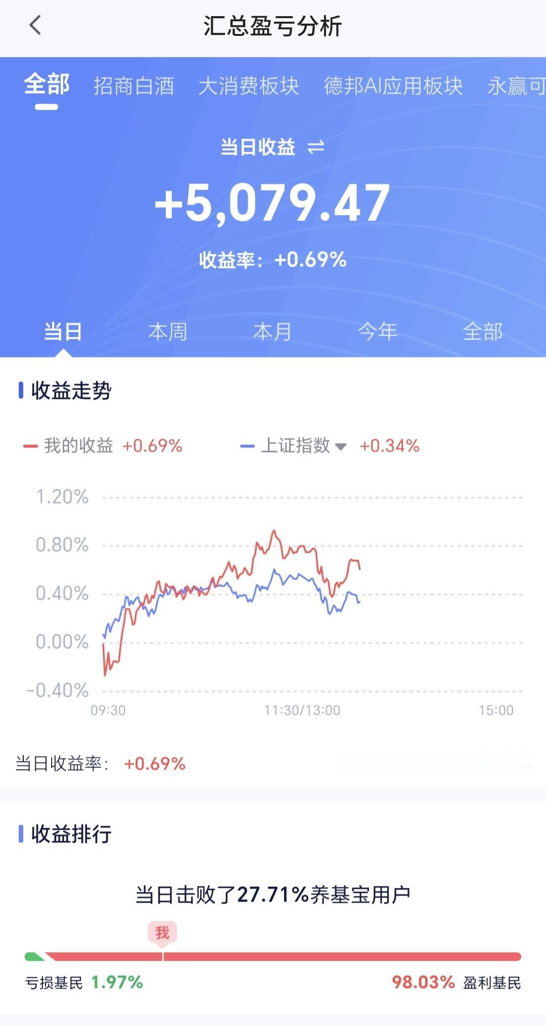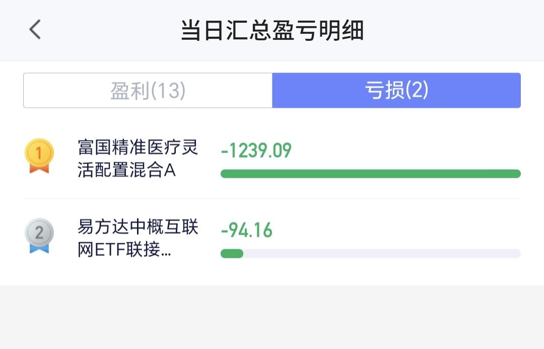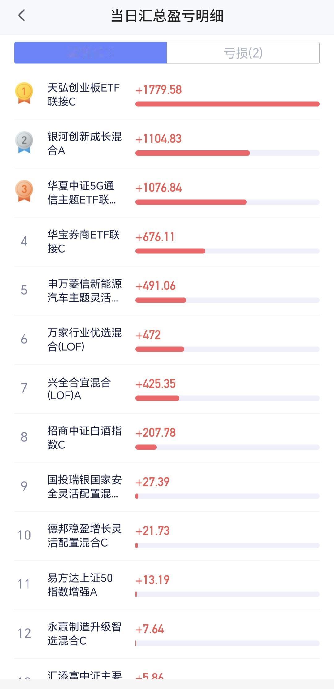 持有的基金中,盘中估值盈利金额最大的三个板块是:创业板指,芯片半导体板块,5G板块,估值亏损的只有创新药板块,估值整体上涨了5079元。