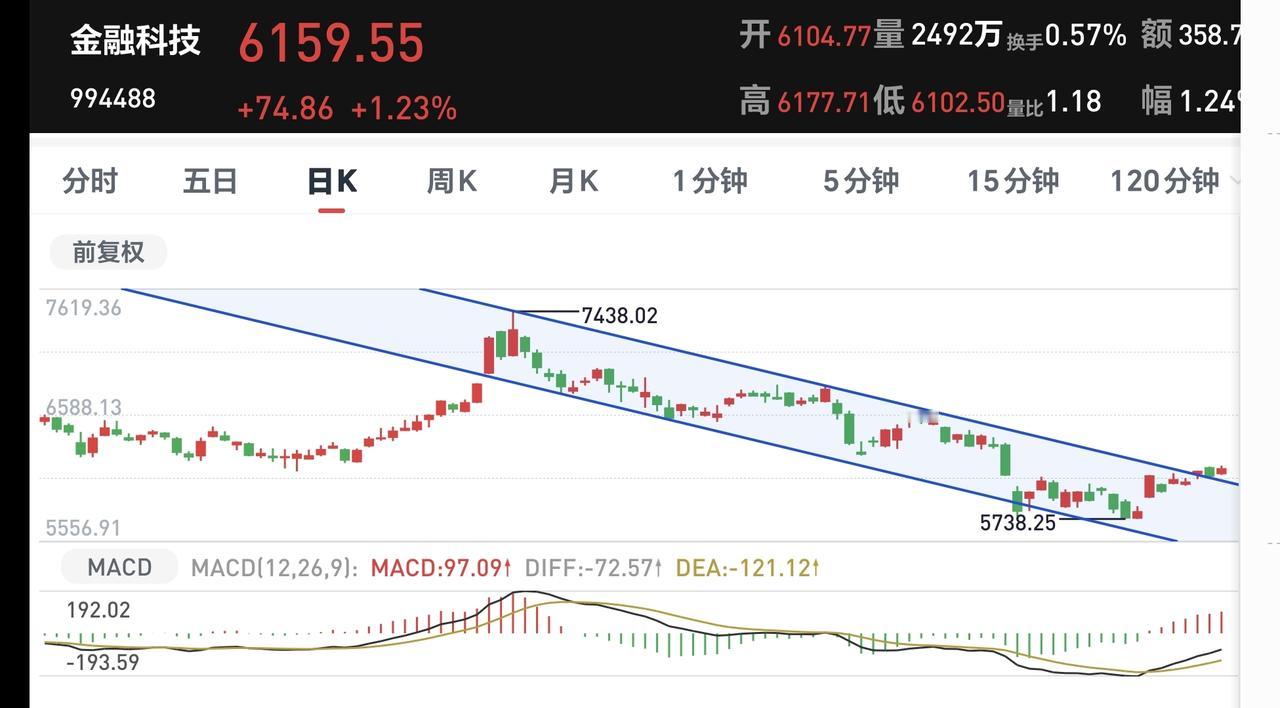 5:金融科技板块上涨突破了日线级别下跌通道的上轨线,而且是处于有效突破当中,短线的人可以考虑要不要进场。