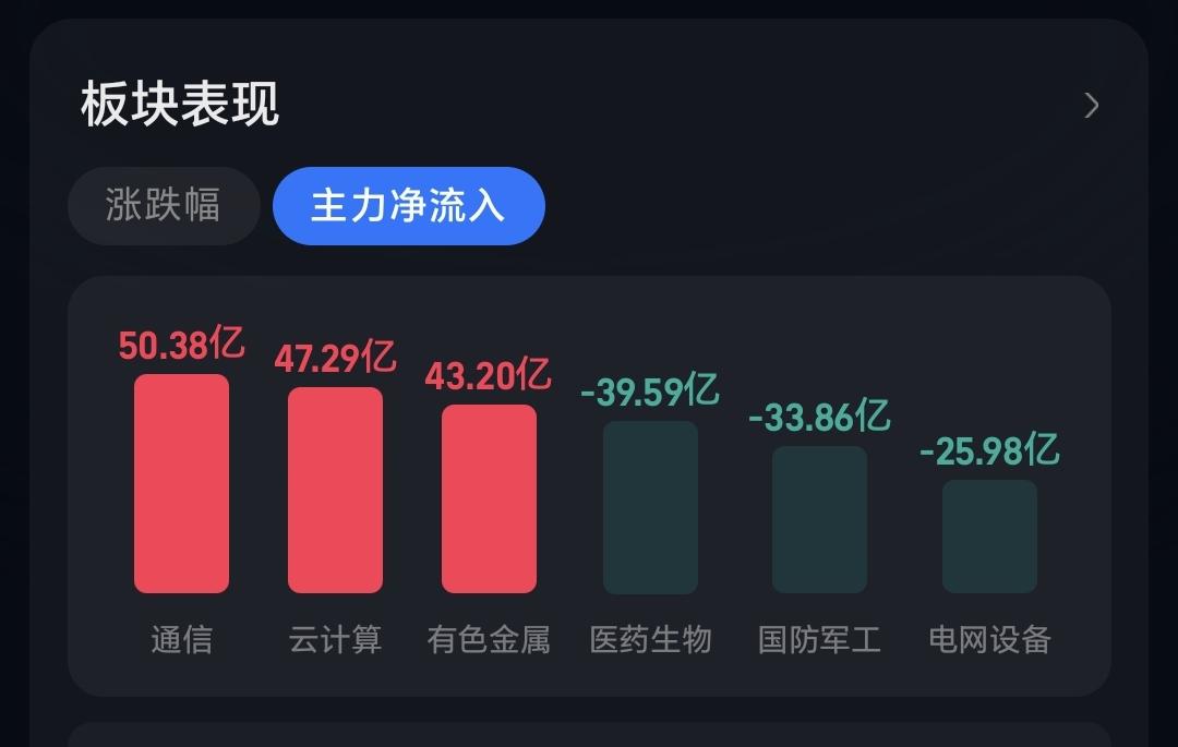 主力资金净流入最多的三个板块是:通信板块,云计算板块,有色金属板块,主力资金净流出最多的三个板块是:医药生物板块,军工板块,电网设备板块。