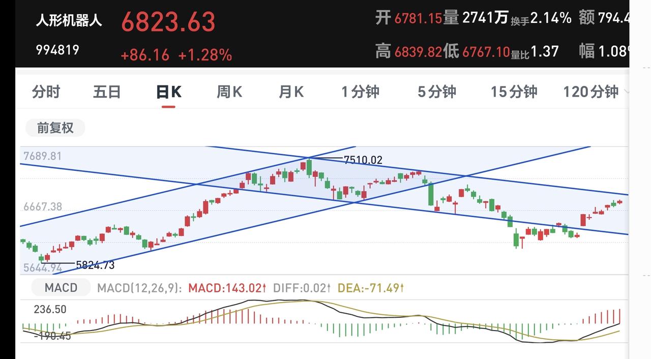 机器人板块日线级别突破下跌通道上轨线的时候,周线级别是处于上涨趋势中,这样的情况之下,进场需要坚决。