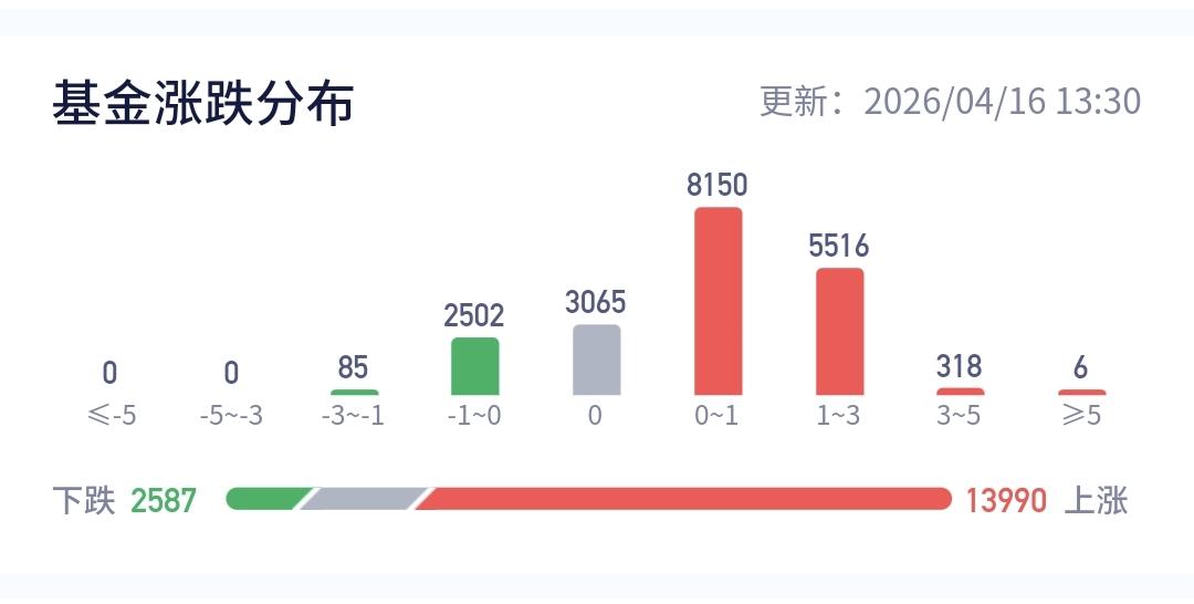 整个基金市场,上涨13990家,下跌2587家,上涨幅度超过5%的6家,没有下跌幅度超过5%的基金。