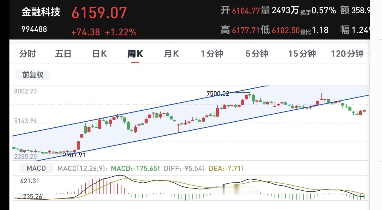 金融科技板块周线级别处于上涨趋势破位中,现在已经形成了一个新的下跌趋势,而且没有能够突破新的下跌通道的上轨线,长线的人继续注意风险。