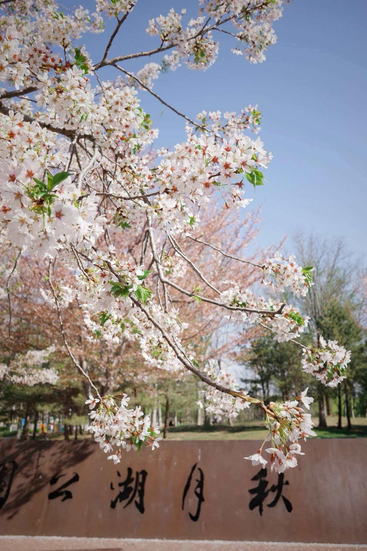 2、秋月湖公园坐拥绝美湖景,四月樱花环湖盛开,落樱纷飞氛围感拉满,平整的草坪和齐全的配套,让野餐和赏花可以同时实现,适合冷食,如果动火,会有人制止。