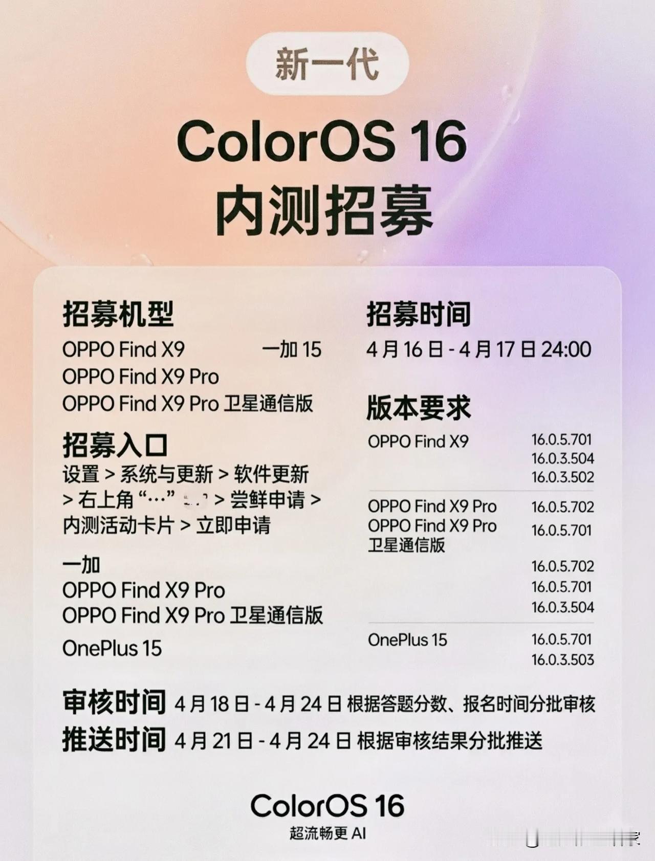 4月16-17日先给Find X9、一加15开内测,5月10日直接推正式版,相当于用半个月时间把bug磨平,正式版一上来就是稳定版,不用当小白鼠,这波很良心。