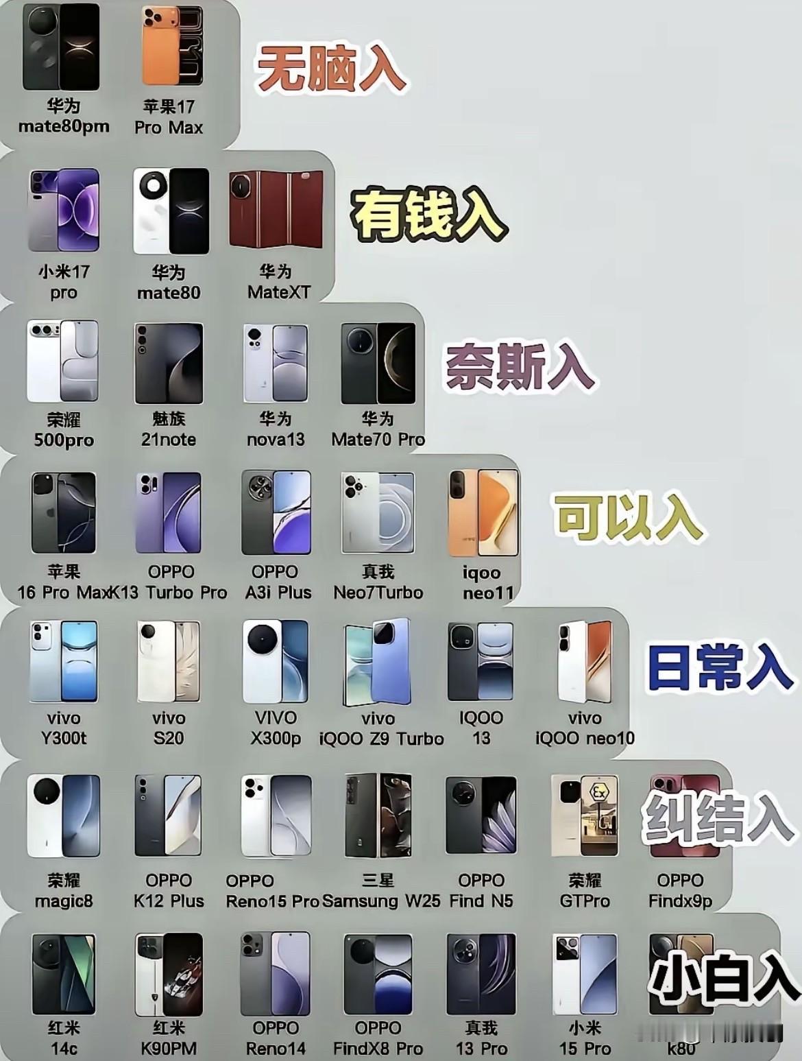 从图中可见,手机分为七大类,有无脑入、有钱入、奈斯入、可以入、日常入、纠结入、小白入,它们分别对应不同价位和品牌的手机,应该能帮助大家挑选到适合自己的产品。感兴趣的朋友可以关注了解,看看能否帮你选到心仪的手机。