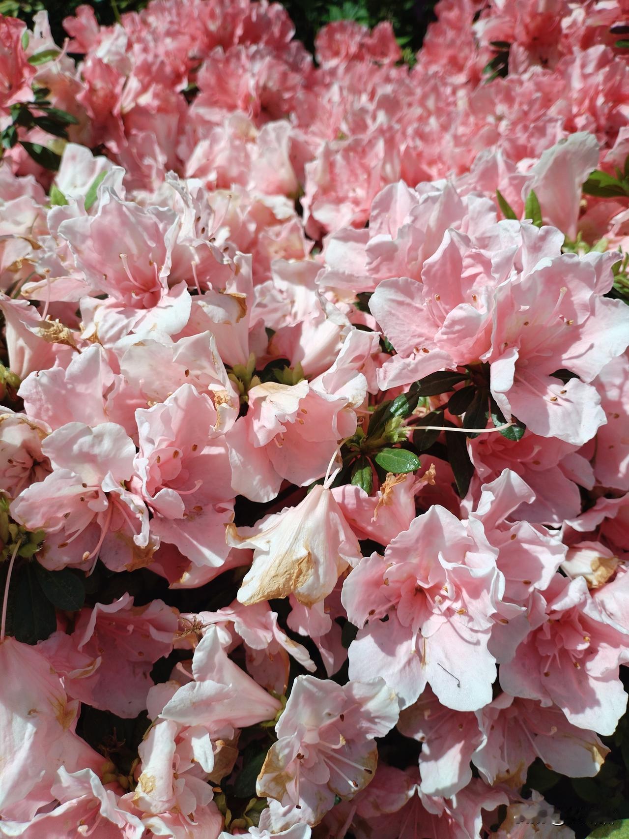 花朵很多,看不见叶子,红的像火焰,粉得像丝绸。