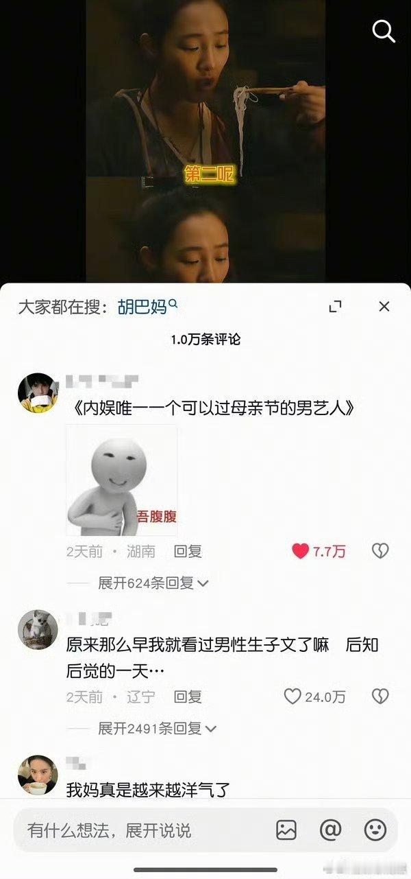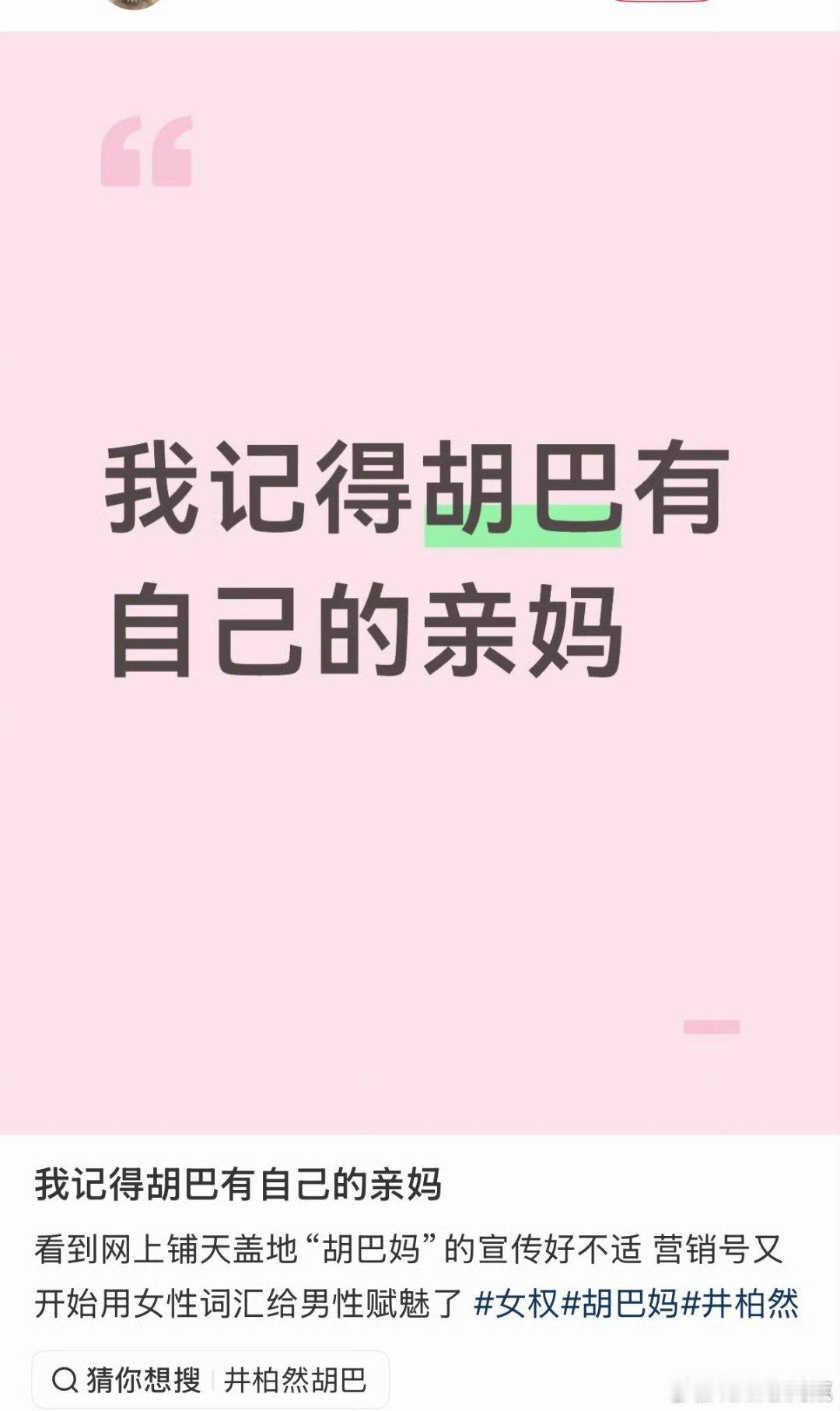 内娱现在真的越来越会玩了,井柏然这边反复营销“胡巴妈”,拿女性词汇给自己赋魅、立温柔人设。明明是男演员,非要往“妈感”上靠,吃着女性身份的红利,又不用承担女性在现实里的压力和偏见,这波操作真的有点刻意又违和。而且很多网友称胡巴妈这个角色其实就是代/孕,应该抵制别搬起石头砸自己的脚…