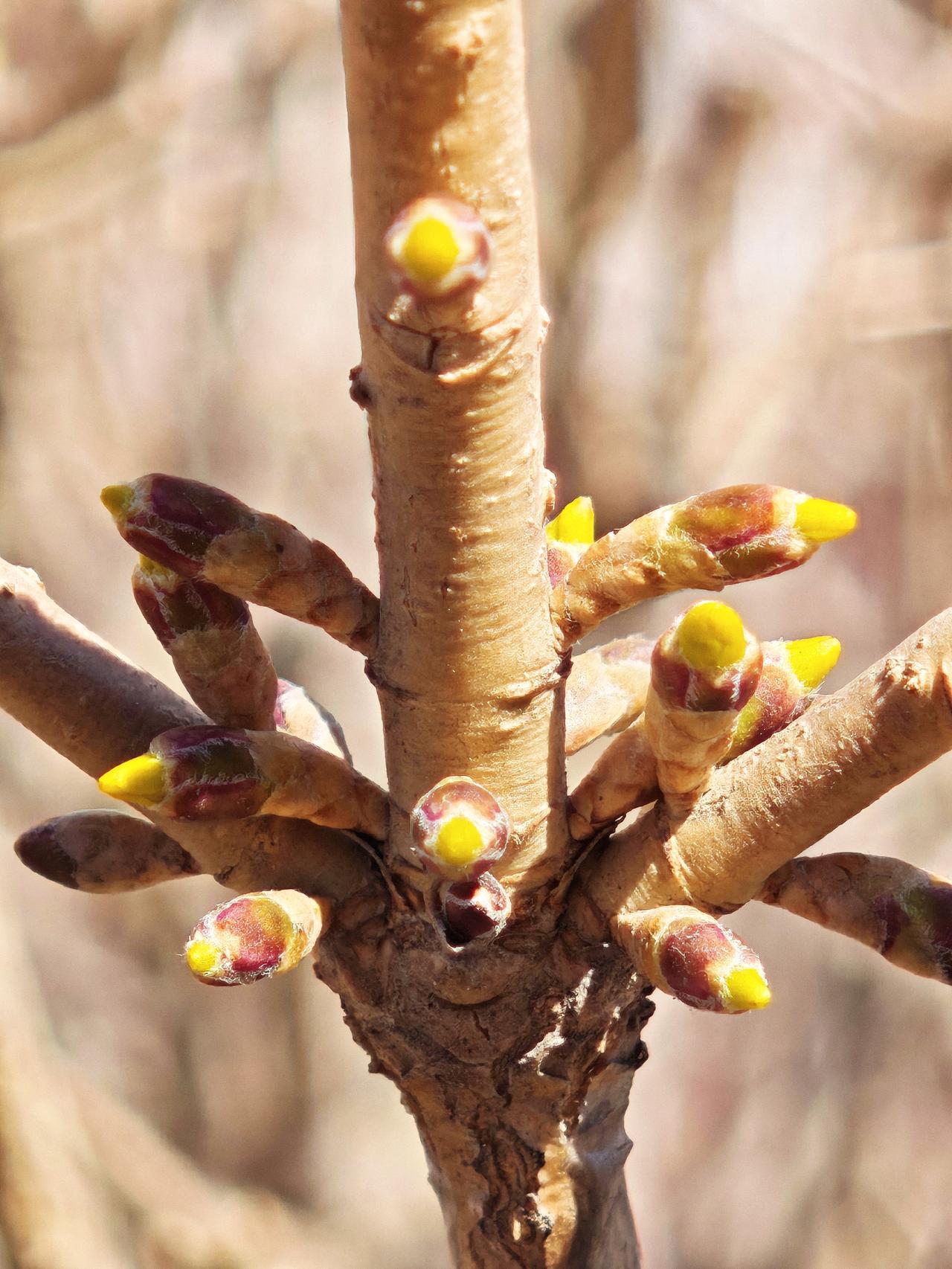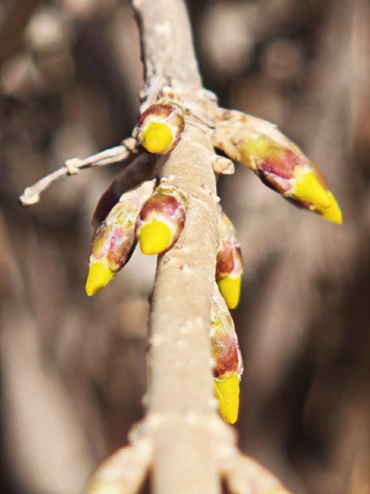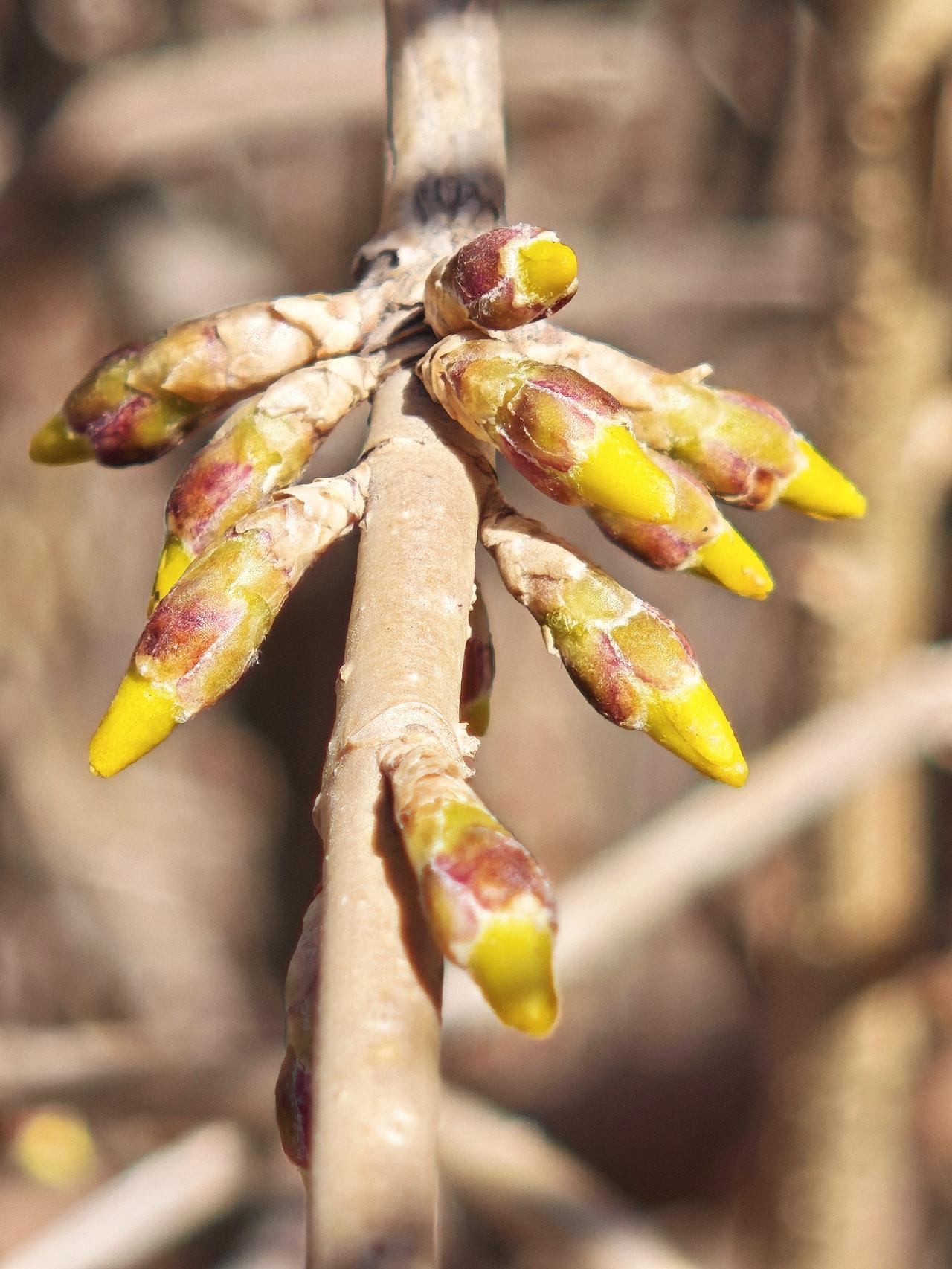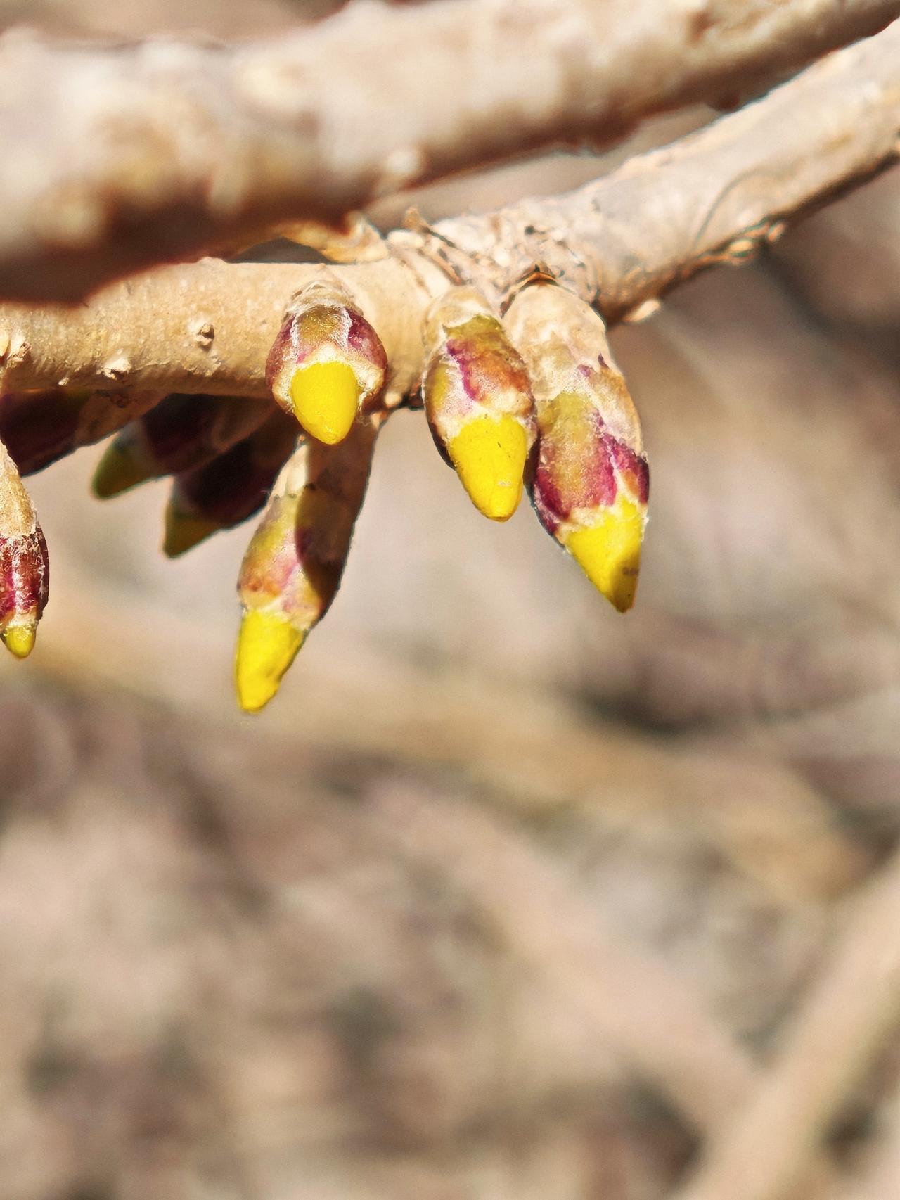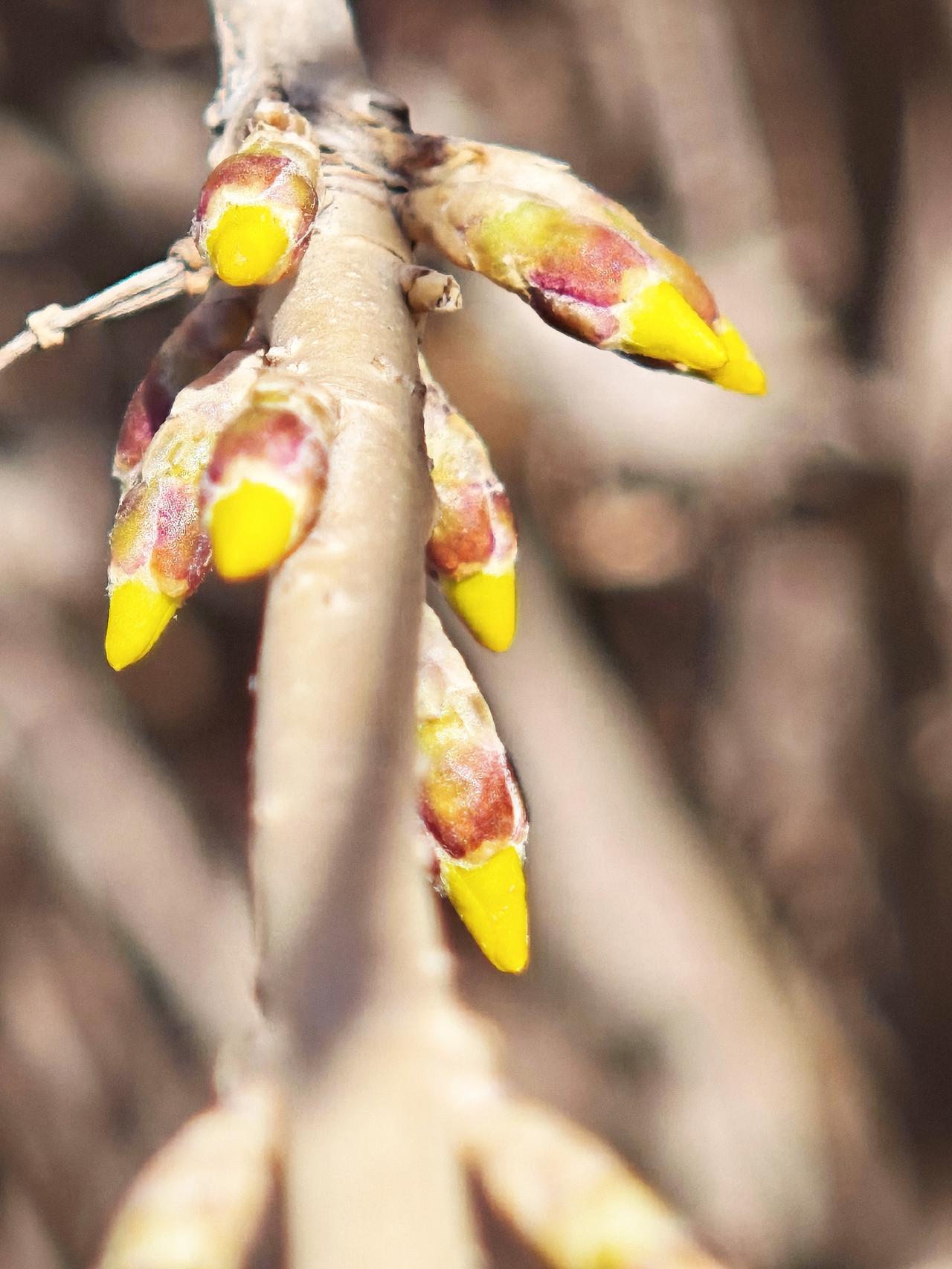 每年四月中旬,小区里连翘花开得一片金黄。此刻,这些连翘花的芽体呈长卵形,刚刚显现出要开放的迹象。