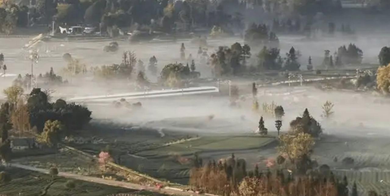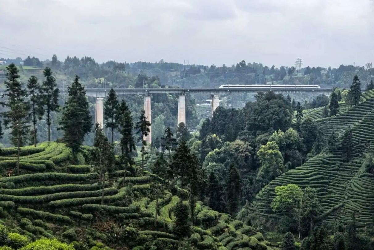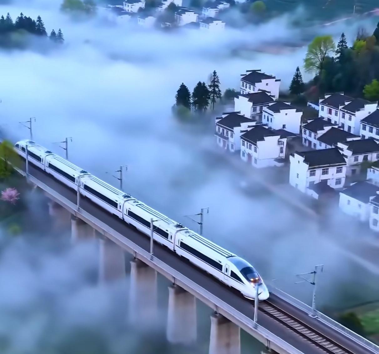 银龙似的动车穿雾而过,现代速度与千年茶韵撞个满怀。晨雾、茶海、村落、远山同框,每一帧都是流动的诗意,堪称春日限定的现实版江山图 。