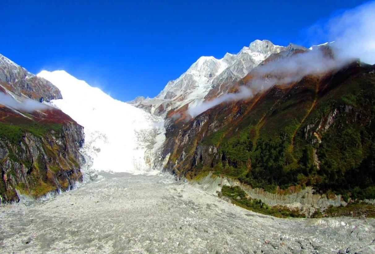 冰川纵横,159条现代冰川蜿蜒山间,冰舌直抵林海,蓝冰与冰裂如水晶雕琢 。