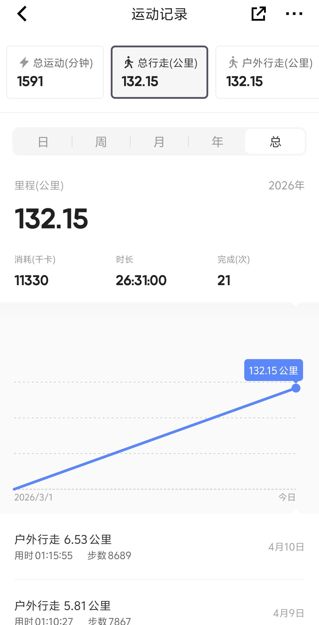 坚持快走21天,时长26.5小时,132公里。继续加油吧!清晨六公里慢跑 每日运动步数 两步路跑步记录 清晨八公里慢跑 居家打卡超慢跑 户外慢跑减肥 步数两万