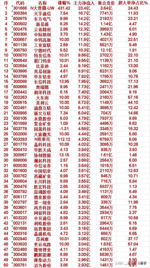 代码:300394,名称:天孚通信,涨幅%:7.54%,主力净流入:16.7亿