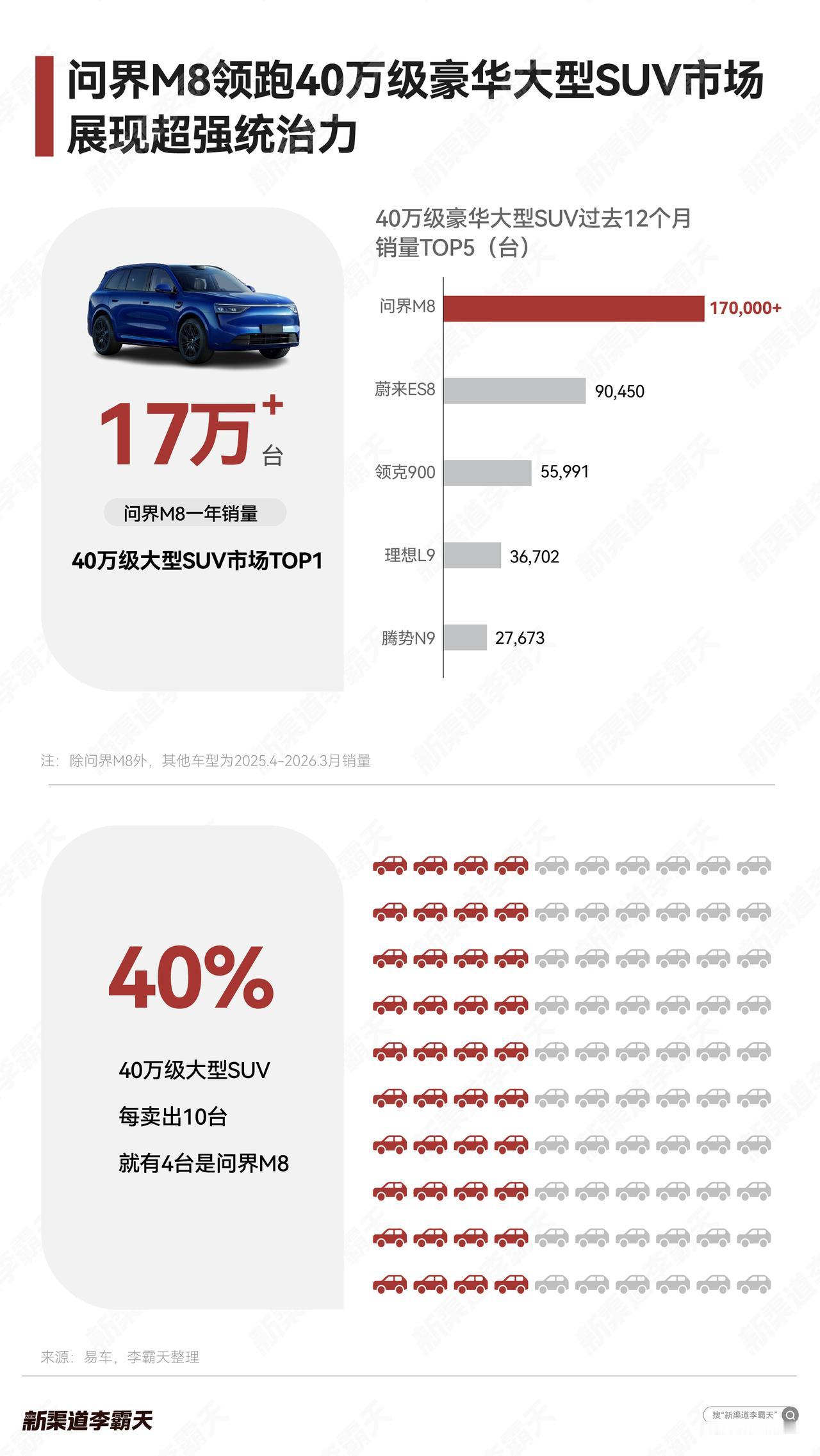 在这个价位的中大型SUV市场上面,每卖出10台就有4台式问界M8,真的太强了。