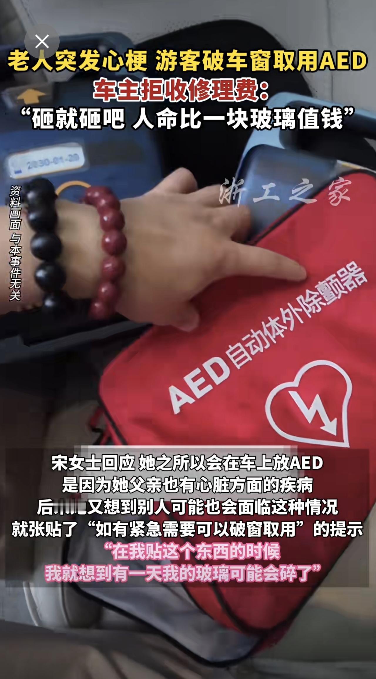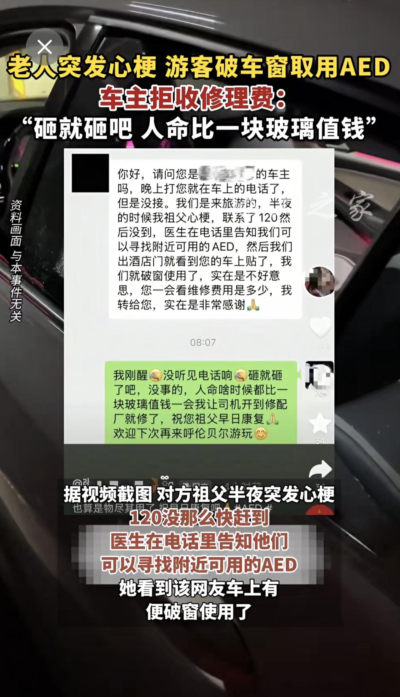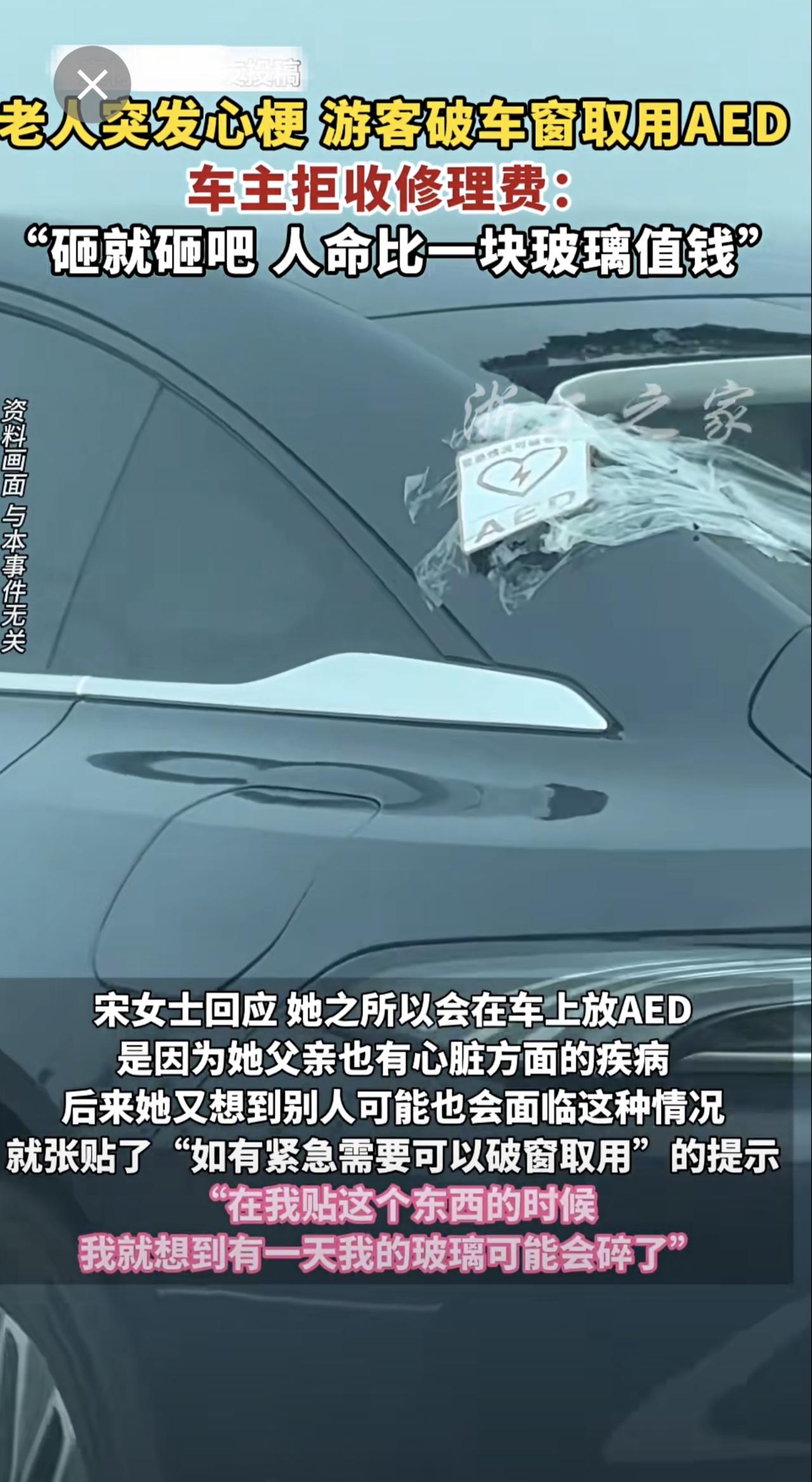 老人突发心梗,游客破车窗取用AED!车主拒收修理费:砸就砸吧,人命比一块玻璃值钱