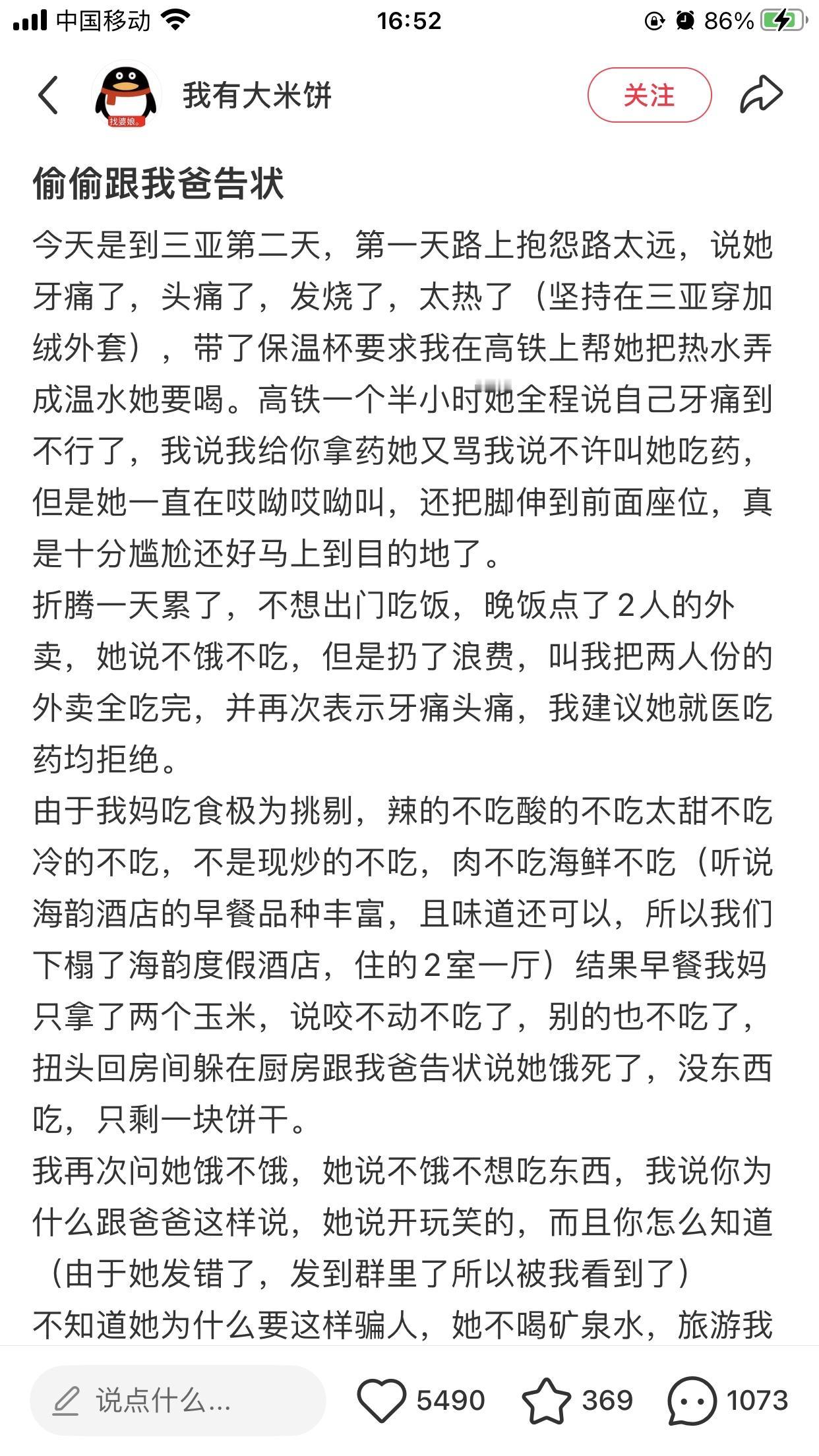 逛景点时故意放慢脚步,时不时扶着头叹气,吃饭时皱着眉吐槽饭菜不合口,连晚上回酒店,都要念叨“早知道这么遭罪,就不来了,都是你非要让我来”,每一句话都像一根针,扎在小陈的心上。