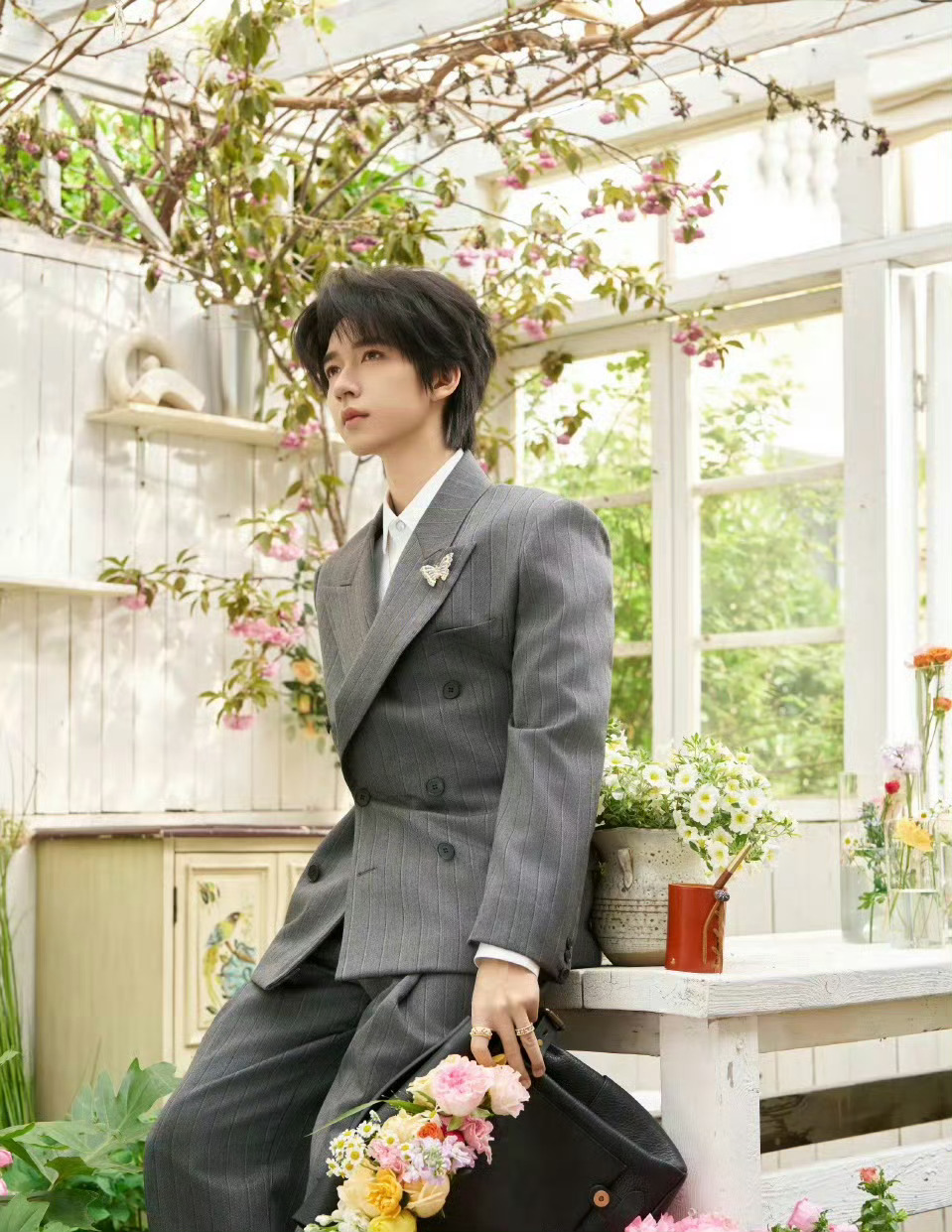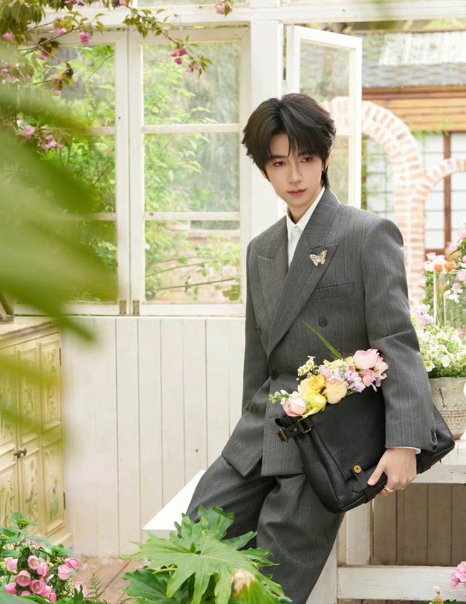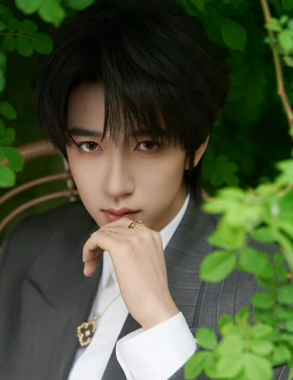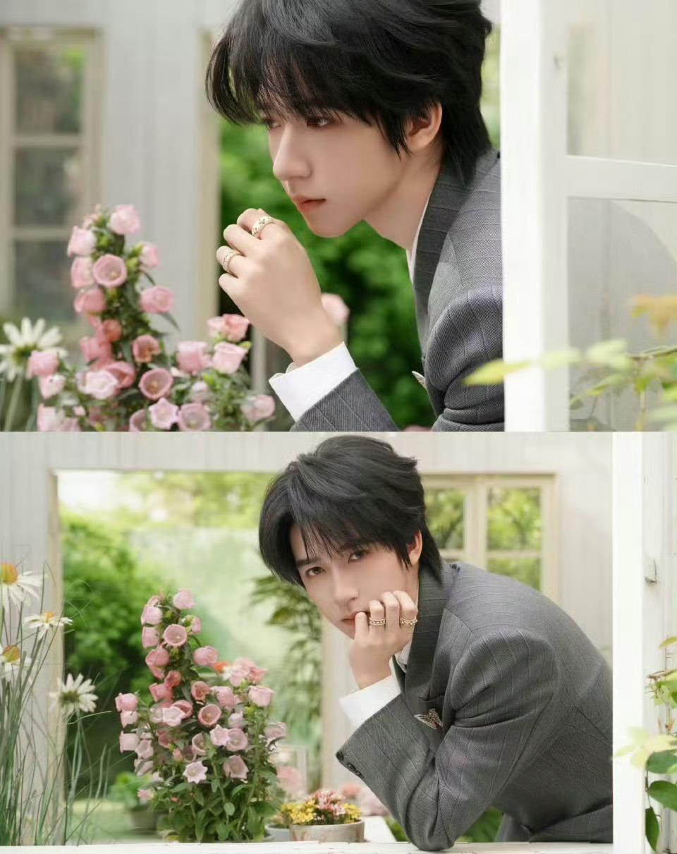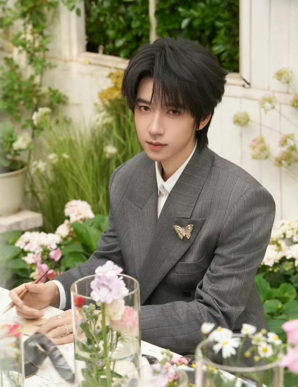贺峻霖身穿Versace西装搭配Buccellati珠宝出席北影节红毯,花园里走